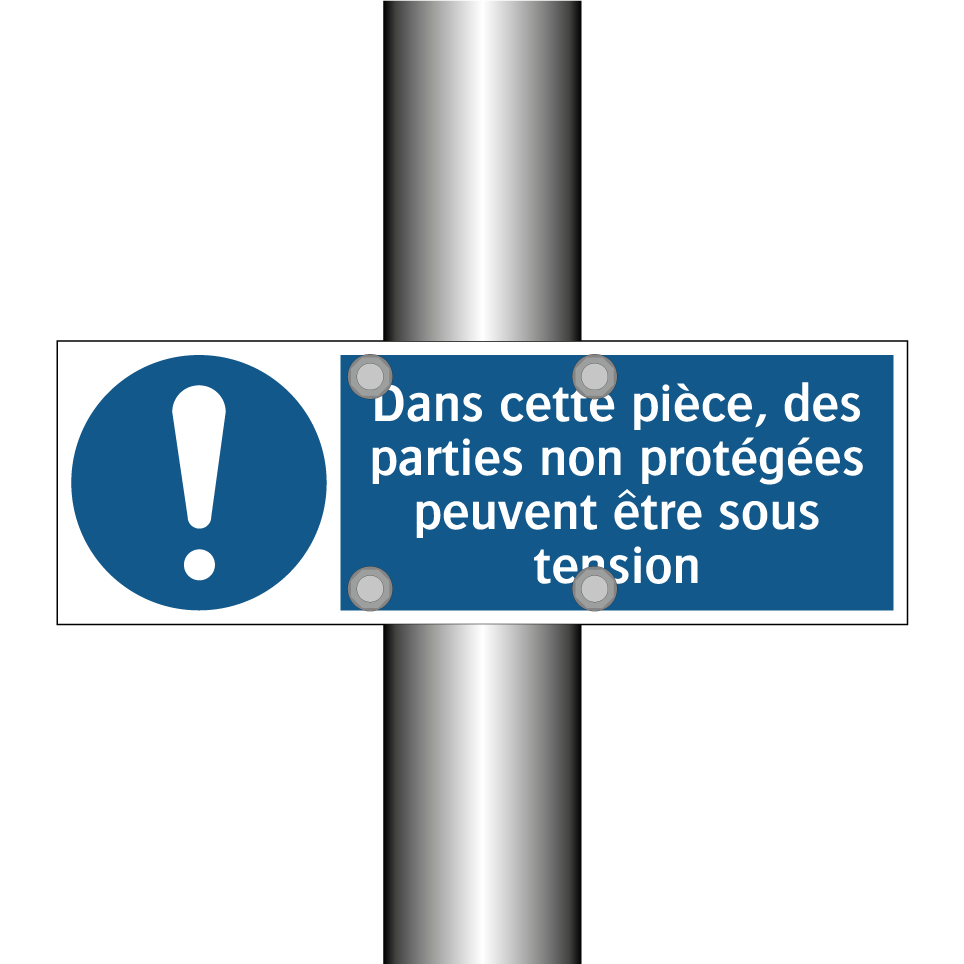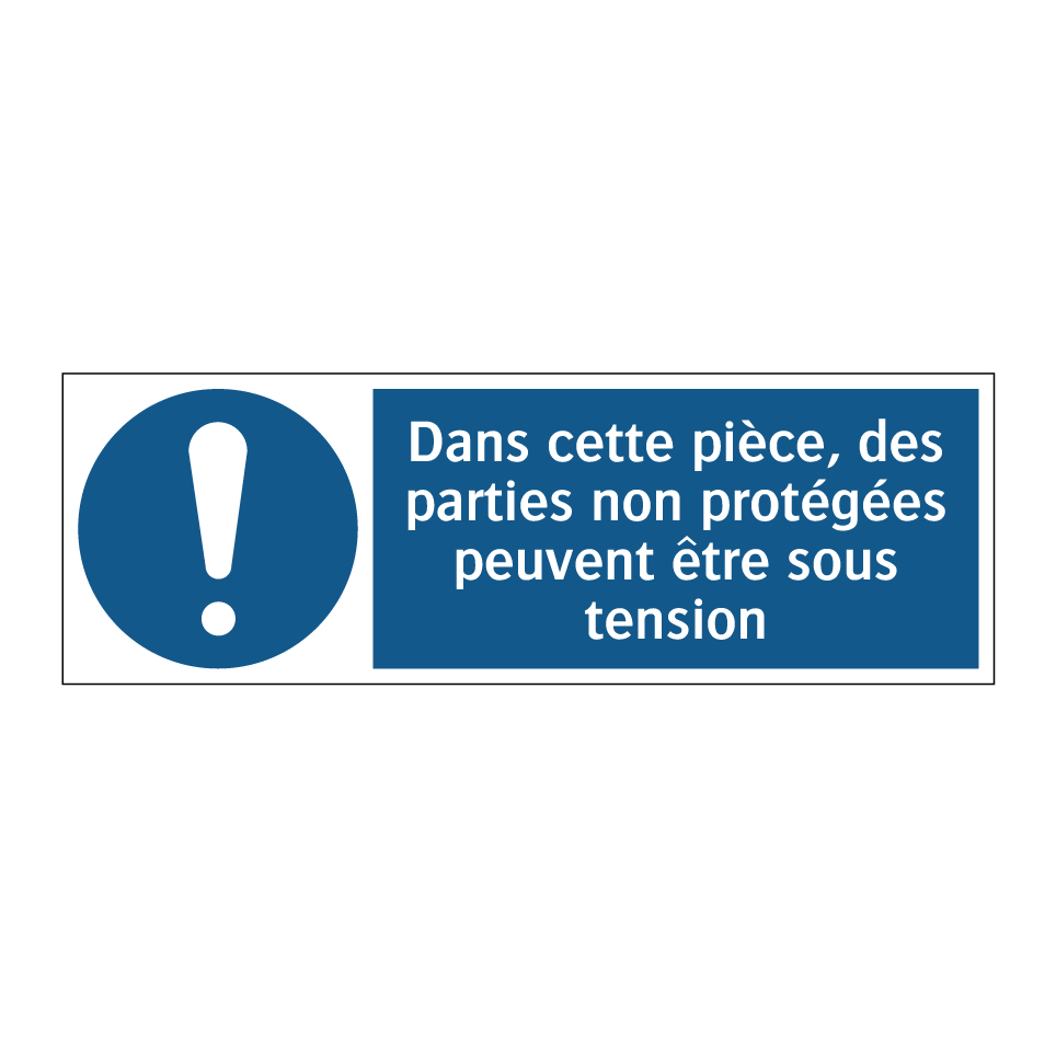 Panneau d'obligation avec le texte : "Dans cette pièce, des parties non protégées peuvent être sous tension"