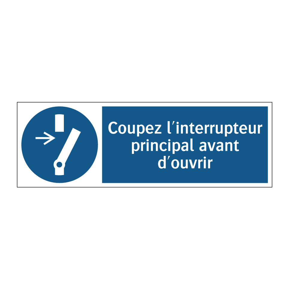 Panneau d'obligation avec le texte : "Coupez l'interrupteur principal avant d'ouvrir"