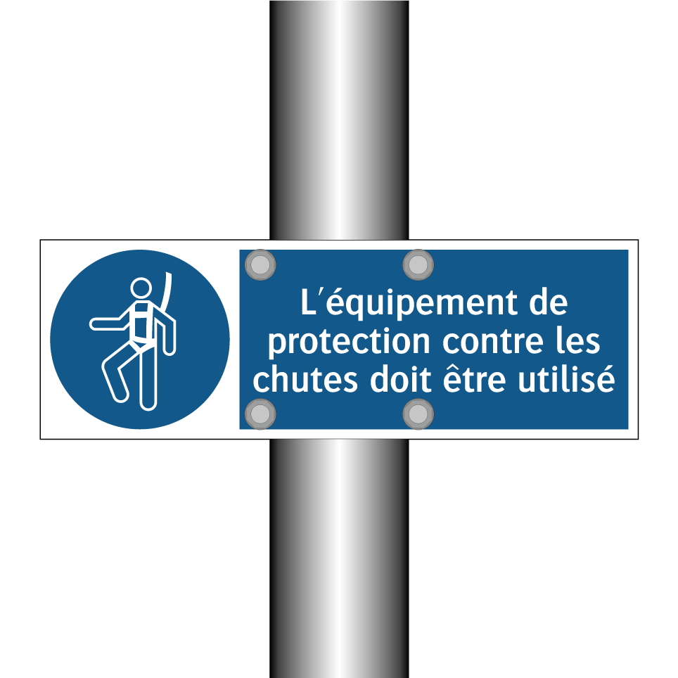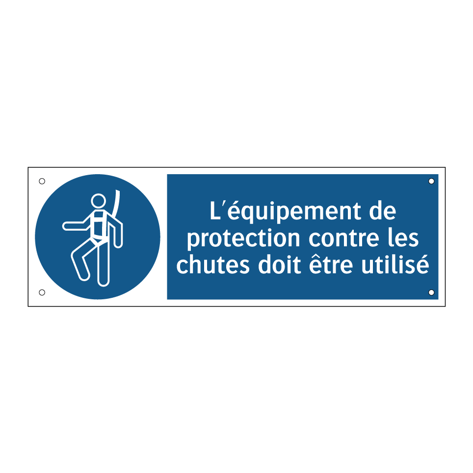 Panneau d'obligation avec le texte : "L'équipement de protection contre les chutes doit être utilisé"