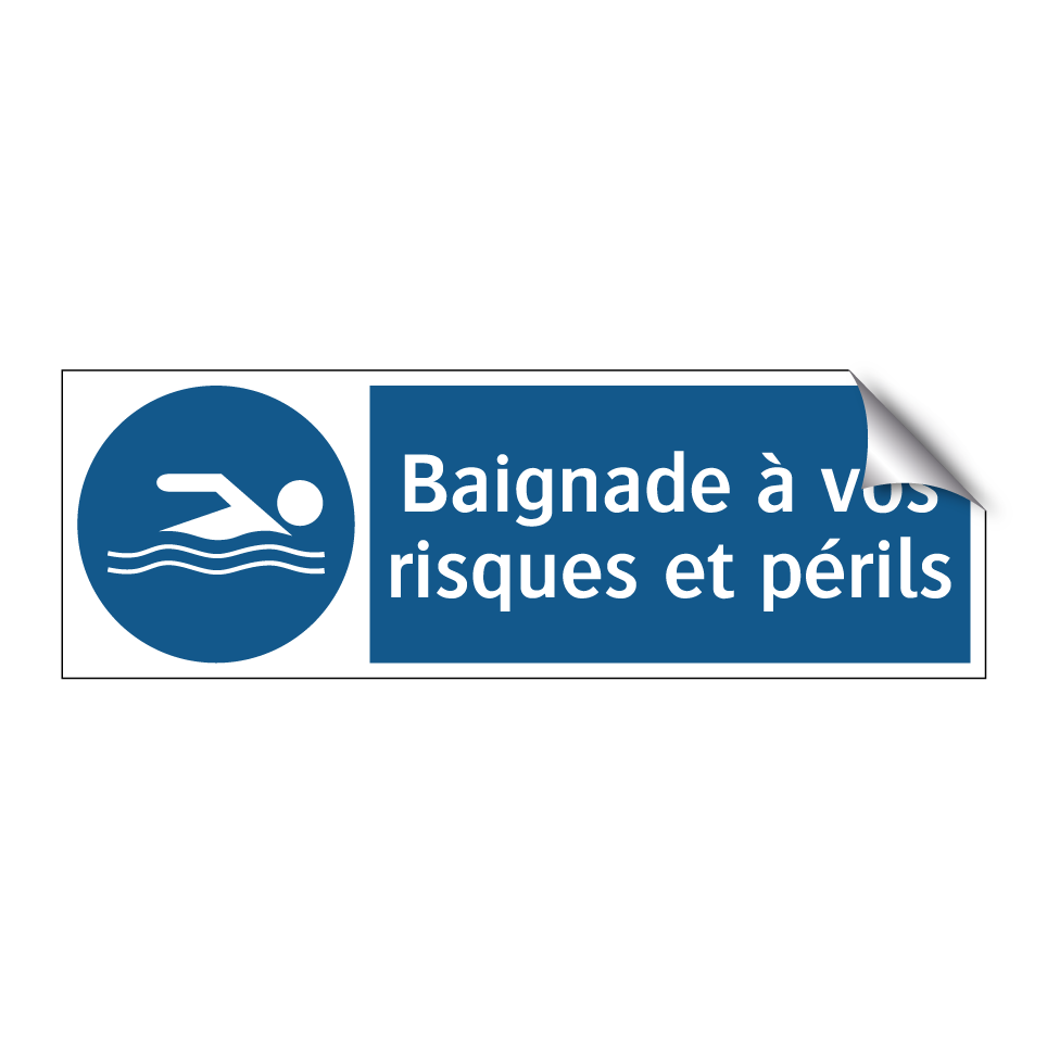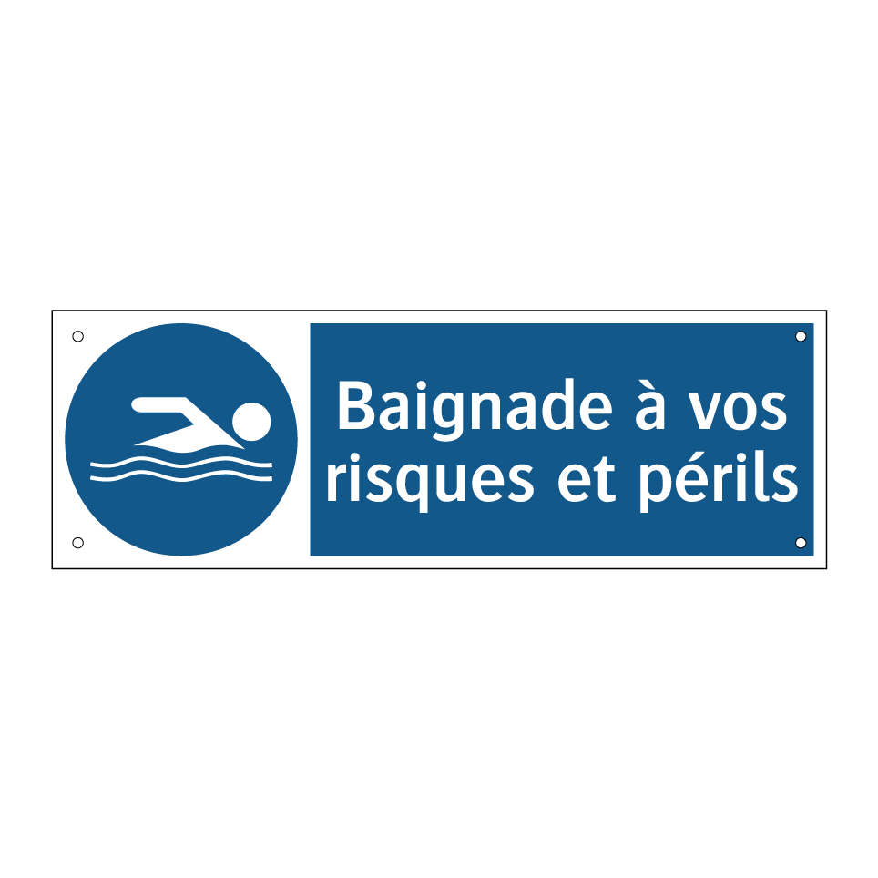 Panneau d'obligation avec le texte : "Baignade à vos risques et périls"