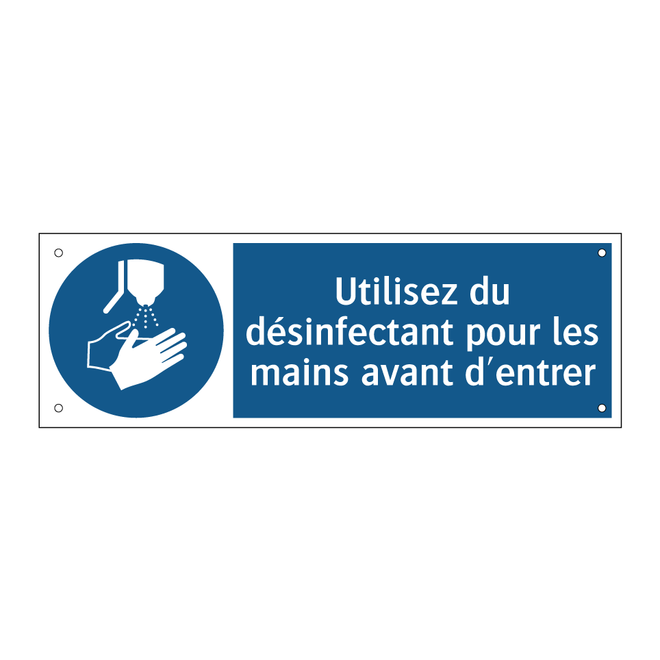 Ce panneau d'obligation est essentiel pour garantir l'hygiène dans les espaces publics. Idéal pour les entrées de bâtiments tels que les bureaux, les écoles, les hôpitaux et les magasins, il rappelle aux visiteurs l'importance de se désinfecter les mains avant de pénétrer à l'intérieur. Grâce à sa couleur bleue et son texte blanc, il attire facilement l'attention et assure une communication claire. Ce type de signalisation est particulièrement utile dans les zones à fort passage pour prévenir la propagation des germes. Placez-le à hauteur des yeux pour maximiser son efficacité et encourager les bonnes pratiques d'hygiène.