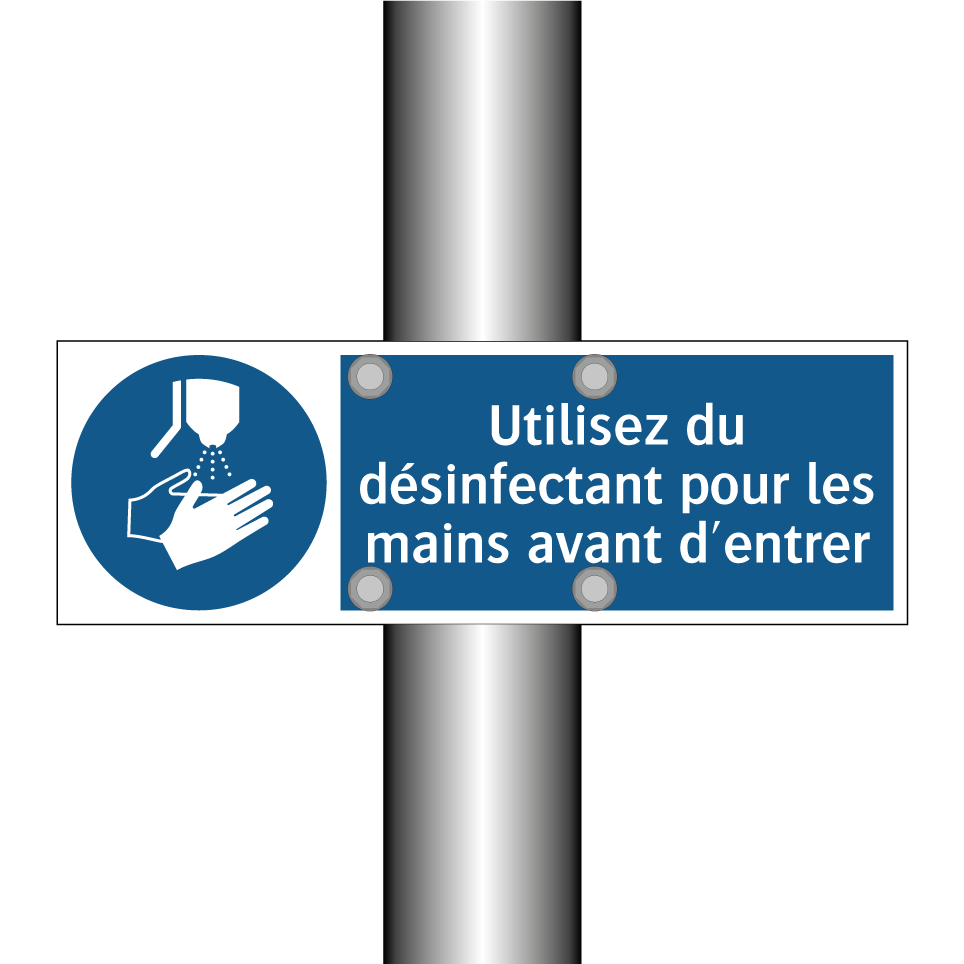 Panneau d'obligation avec le texte : "Utilisez du désinfectant pour les mains avant d'entrer"