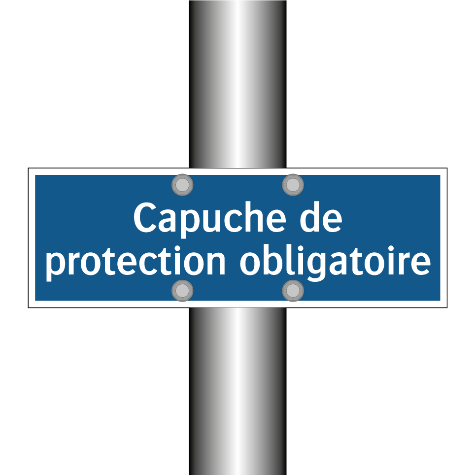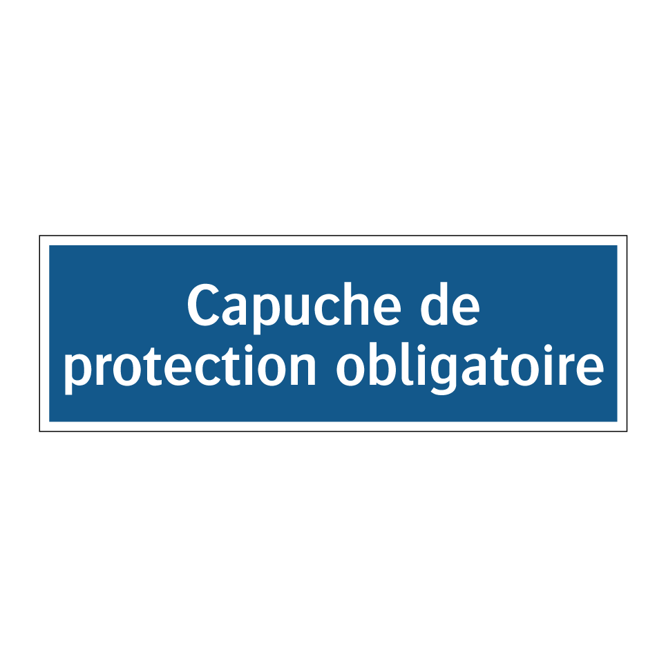 Panneau d'obligation avec le texte : "Capuche de protection obligatoire"