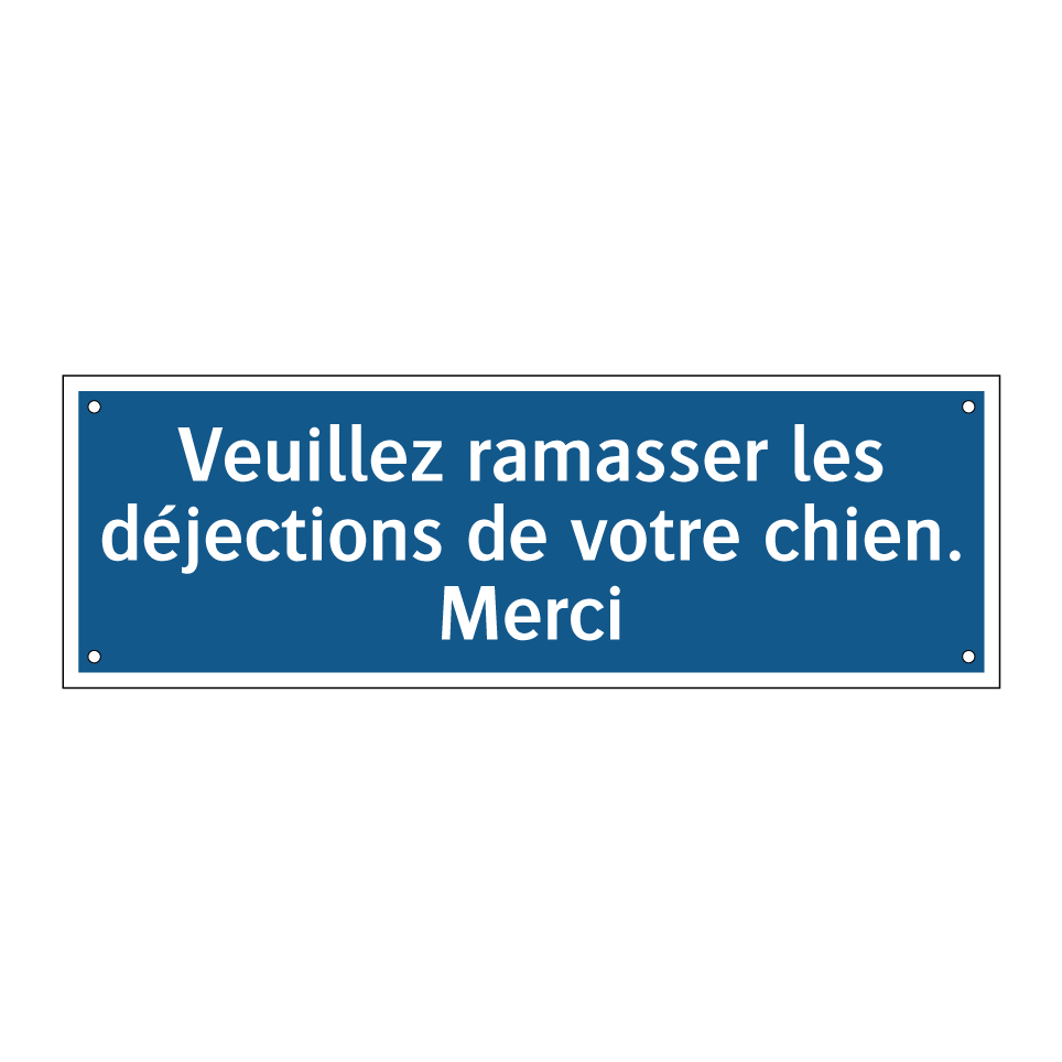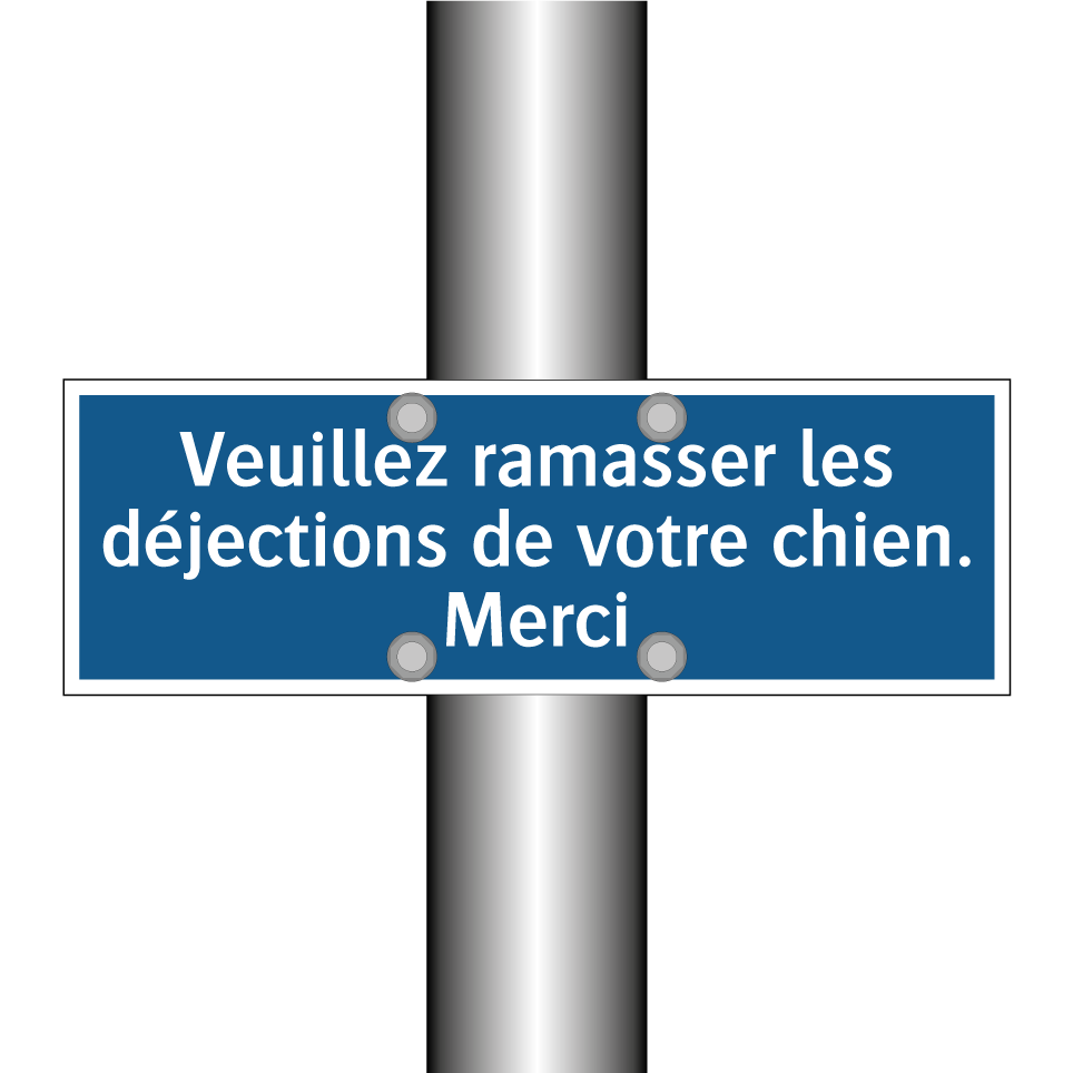 Panneau d'obligation avec le texte : "Veuillez ramasser les déjections de votre chien. Merci"