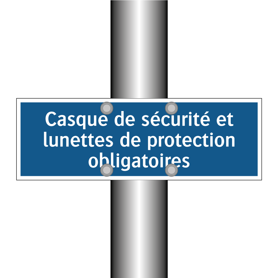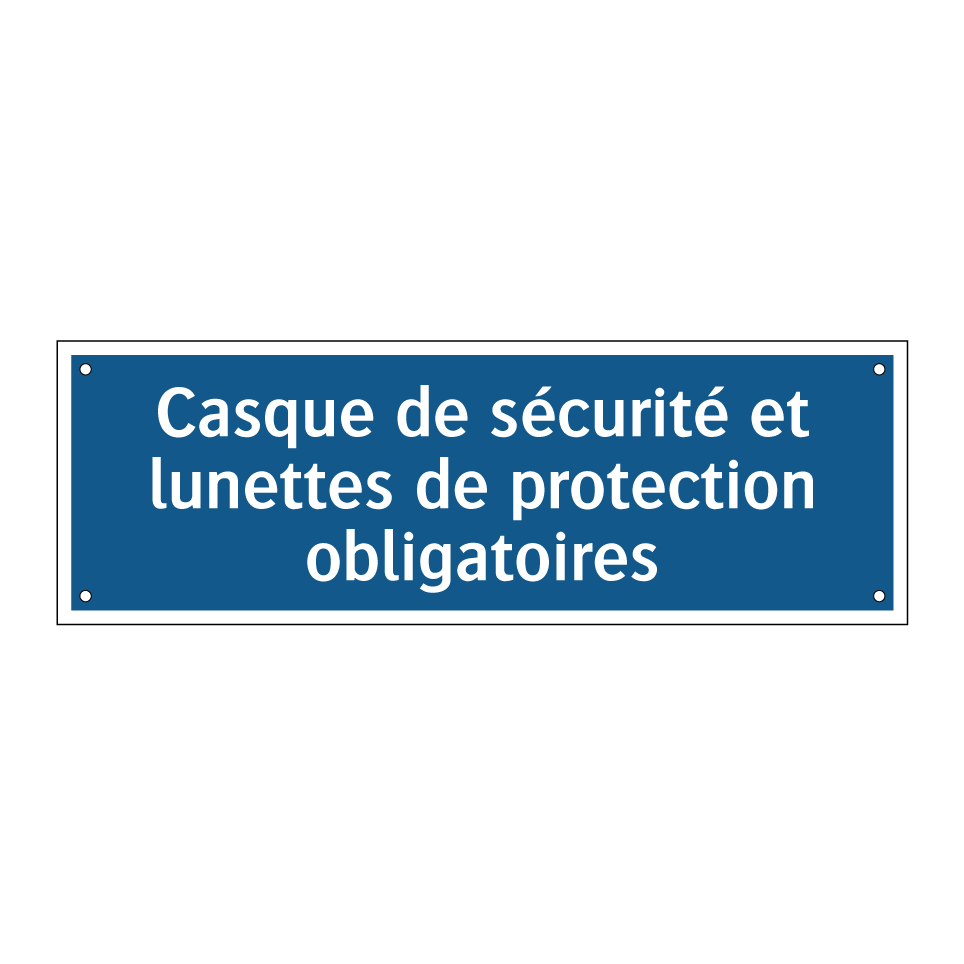 Panneau d'obligation avec le texte : "Casque de sécurité et lunettes de protection obligatoires"