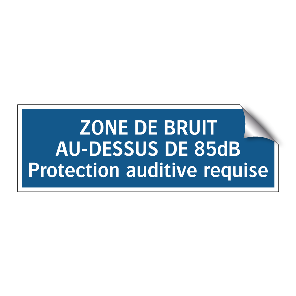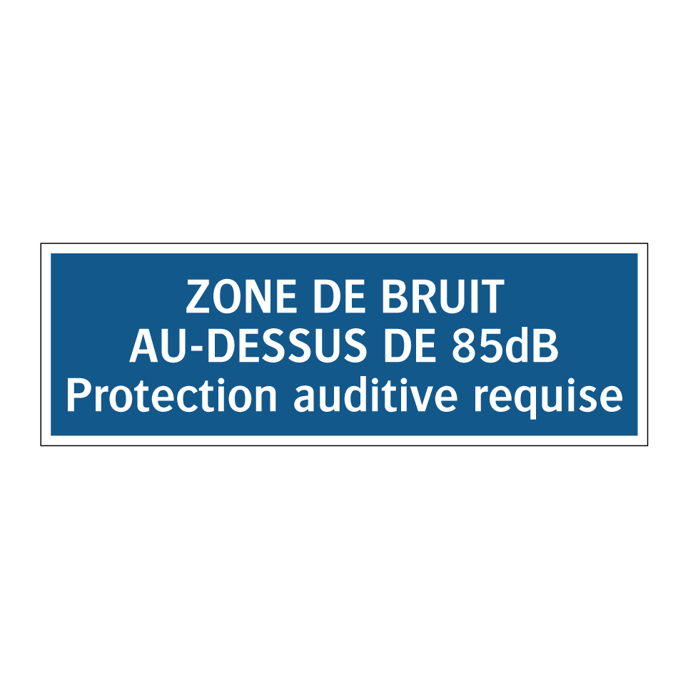 Panneau d'obligation avec le texte : "ZONE DE BRUIT AU-DESSUS DE 85dB Protection auditive requise"