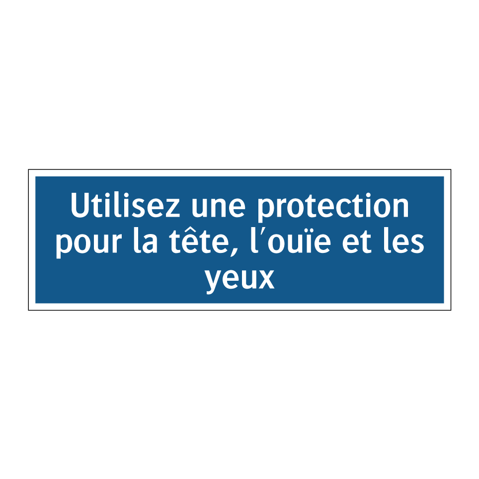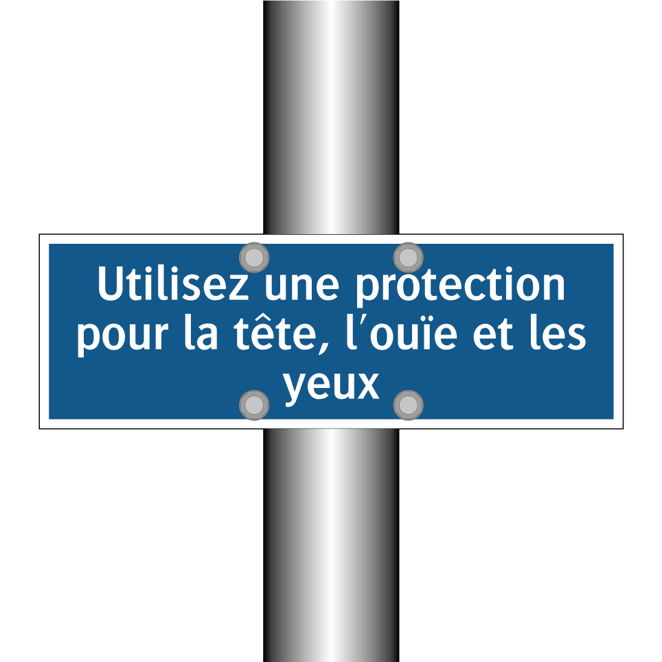 Panneau d'obligation avec le texte : "Utilisez une protection pour la tête, l'ouïe et les yeux"