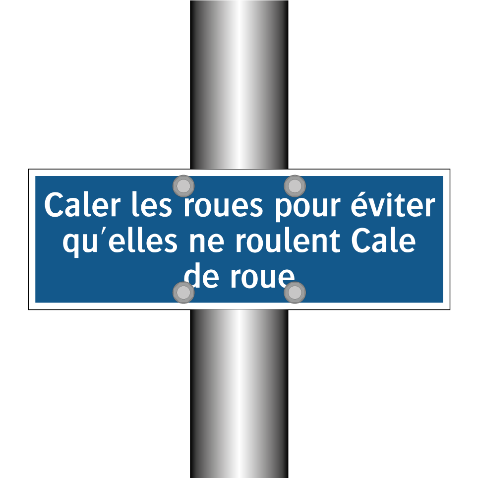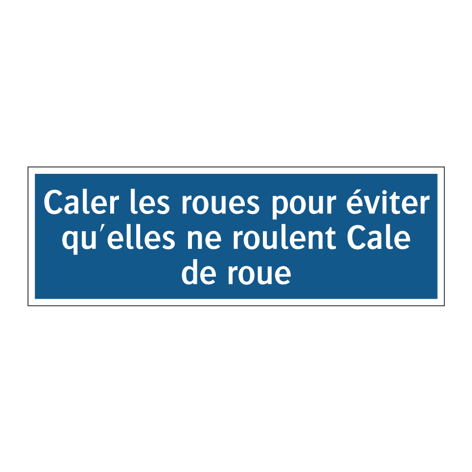 Panneau d'obligation avec le texte : "Caler les roues pour éviter qu'elles ne roulent Cale de roue"