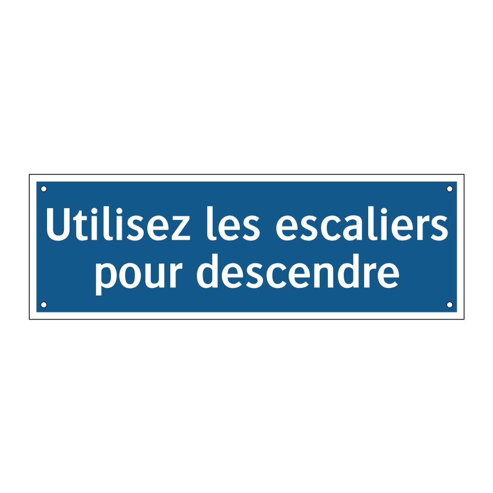 Ce panneau d'obligation est essentiel pour garantir la sécurité dans les bâtiments publics et privés. Il est idéalement placé à proximité des ascenseurs ou des escaliers mécaniques pour indiquer clairement aux usagers qu'ils doivent utiliser les escaliers pour descendre. Ce type de signalisation est particulièrement utile dans les immeubles de bureaux, les centres commerciaux, les gares et les aéroports, où le flux de personnes est important. En installant ce panneau, vous contribuez à fluidifier la circulation et à prévenir les encombrements. Sa couleur bleue et son texte blanc assurent une visibilité optimale, attirant l'attention des passants et facilitant la compréhension immédiate du message.
