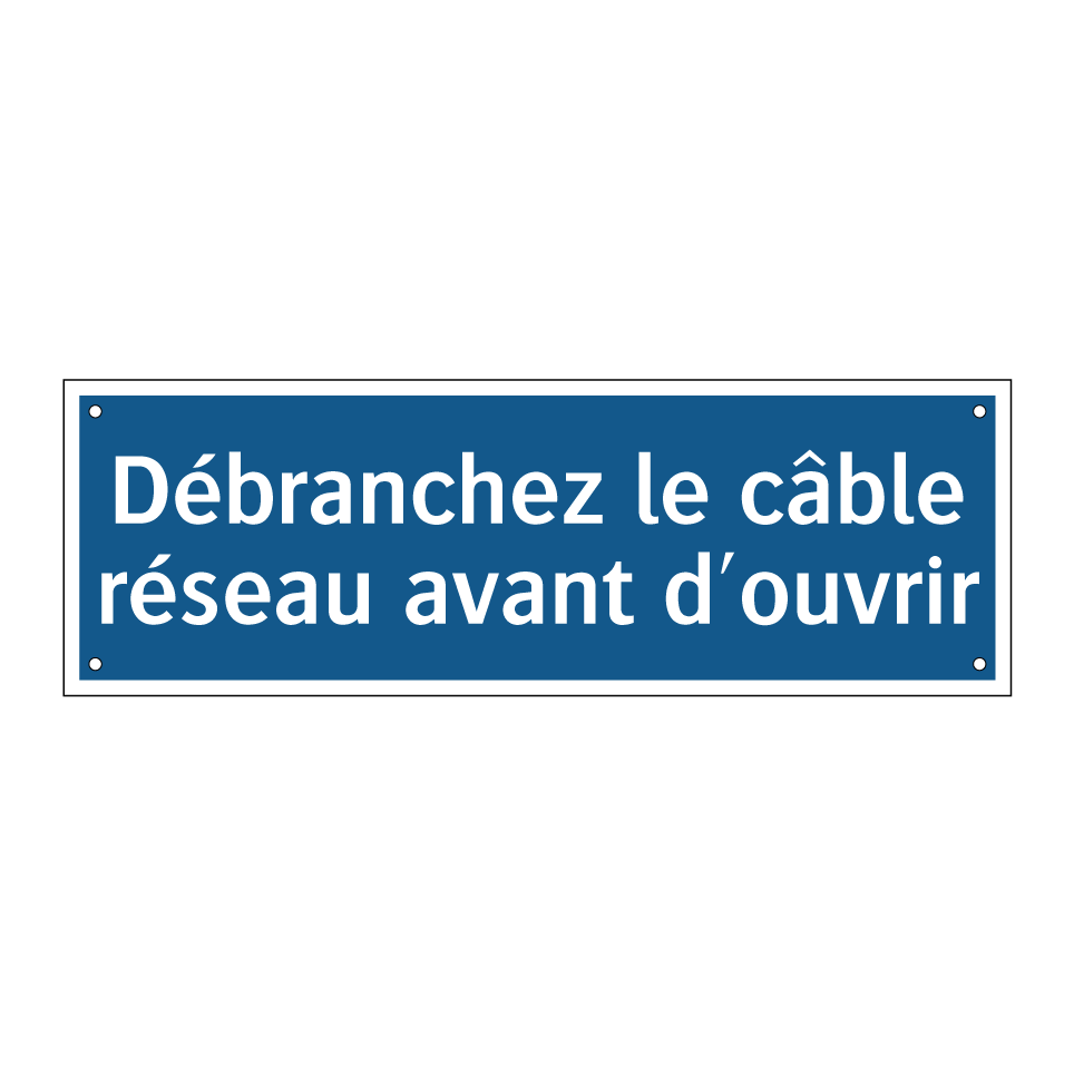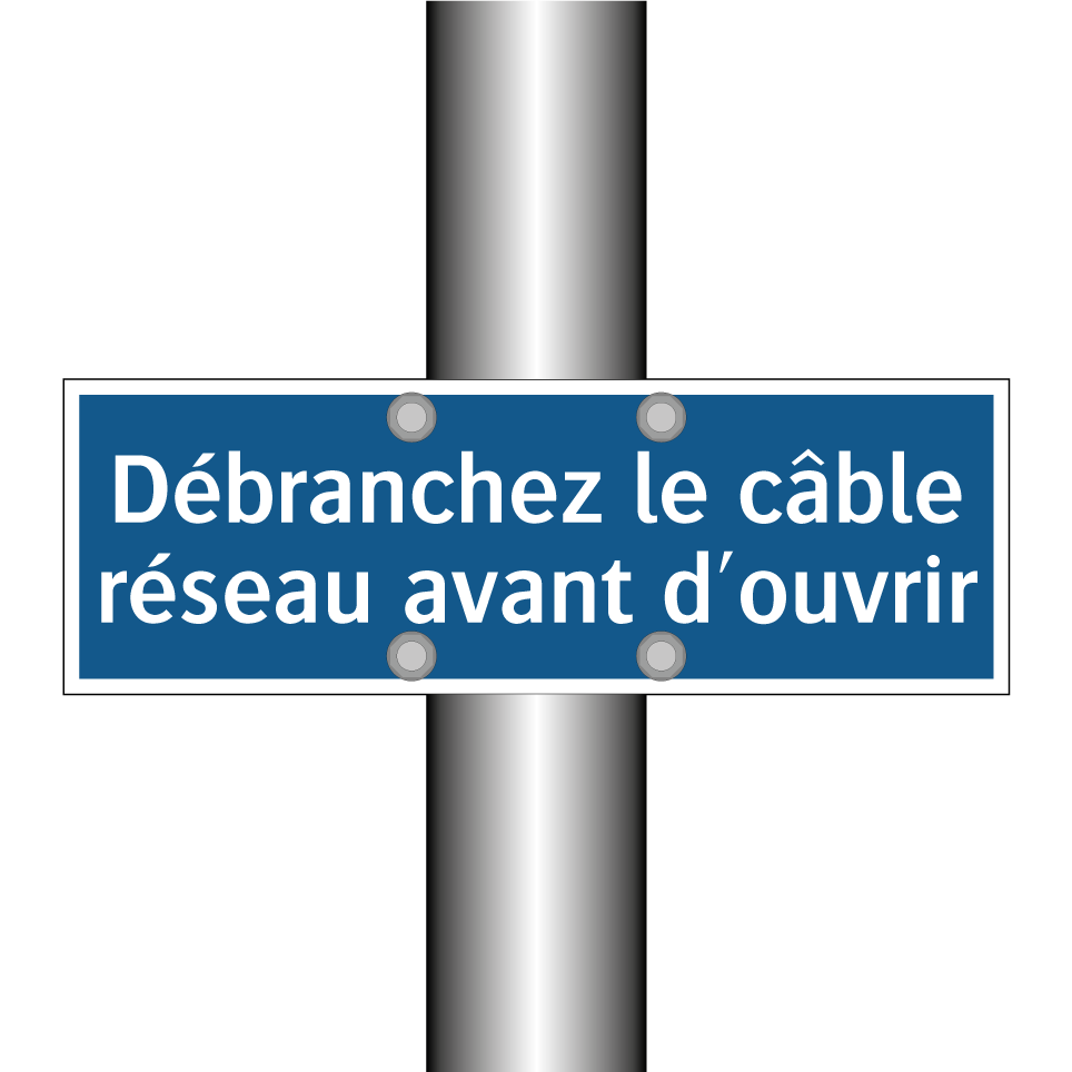 Panneau d'obligation avec le texte : "Débranchez le câble réseau avant d'ouvrir"
