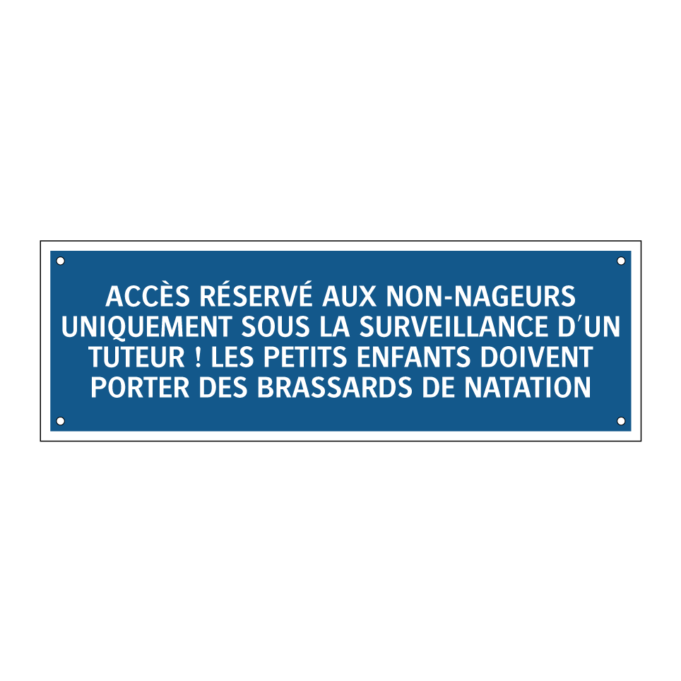 Ce panneau d'obligation est essentiel pour garantir la sécurité dans les zones aquatiques. Il est idéalement placé à l'entrée des piscines ou des espaces de baignade pour informer les visiteurs des règles à suivre. Ce panneau informe que l'accès est strictement réservé aux non-nageurs, qui doivent être sous la surveillance d'un adulte responsable. De plus, il rappelle l'importance pour les jeunes enfants de porter des dispositifs de flottaison, tels que des brassards, pour assurer leur sécurité. En installant ce panneau, vous contribuez à créer un environnement sûr et sécurisé pour tous les utilisateurs de la piscine.
