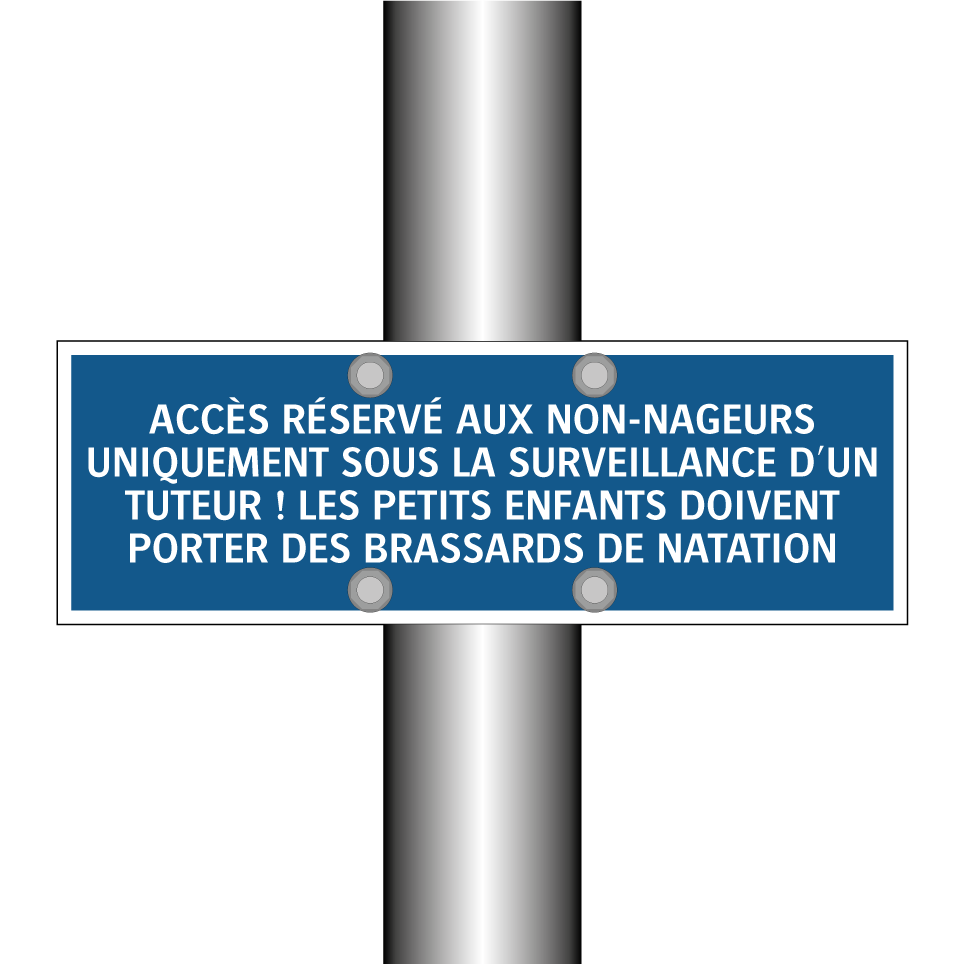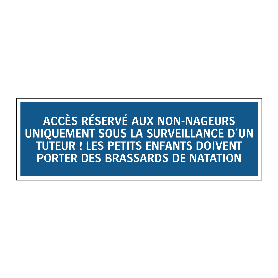 Panneau d'obligation avec le texte : "ACCÈS RÉSERVÉ AUX NON-NAGEURS UNIQUEMENT SOUS LA SURVEILLANCE D'UN TUTEUR ! LES PETITS ENFANTS DOIVENT PORTER DES BRASSARDS DE NATATION."