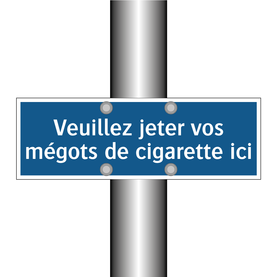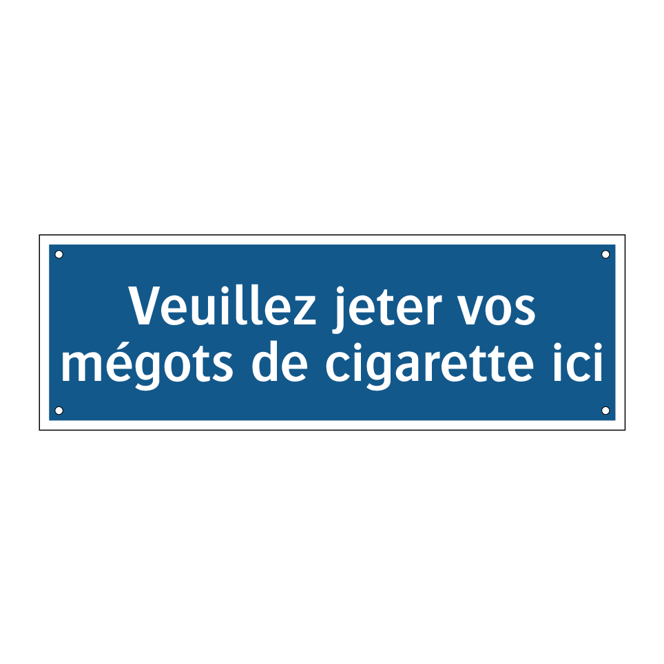 Ce panneau d'obligation est essentiel pour maintenir la propreté de vos espaces extérieurs. Idéal pour les zones fumeurs, il encourage les visiteurs à se débarrasser de leurs mégots de manière responsable. Placez-le à l'entrée des bâtiments, dans les parcs, ou à proximité des zones désignées pour fumer afin de rappeler aux usagers l'importance de respecter l'environnement. Ce panneau, avec son fond bleu et son texte blanc, attire l'attention et transmet un message clair et direct. En installant ce panneau, vous contribuez à un environnement plus propre et plus agréable pour tous.
