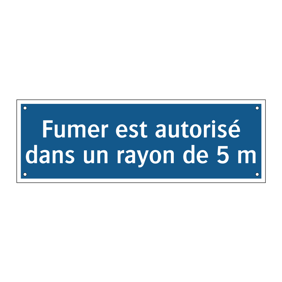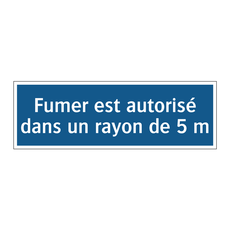 Panneau d'obligation avec le texte : "Fumer est autorisé dans un rayon de 5 m"
