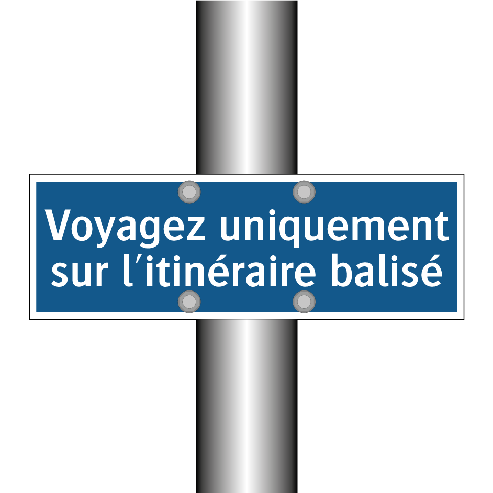 Panneau d'obligation avec le texte : "Voyagez uniquement sur l'itinéraire balisé"