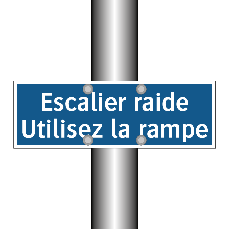 Panneau d'obligation avec le texte : "Escalier raide Utilisez la rampe"