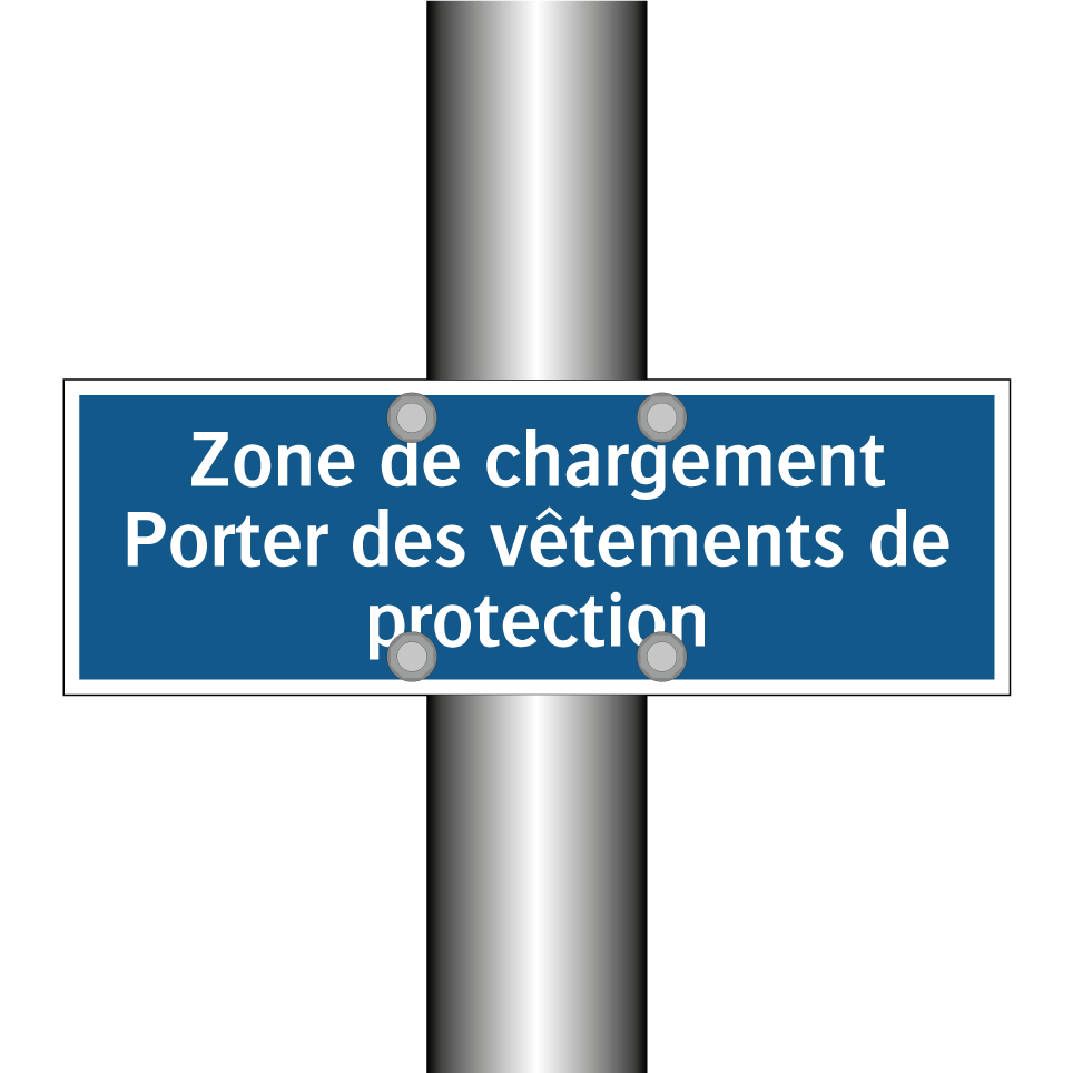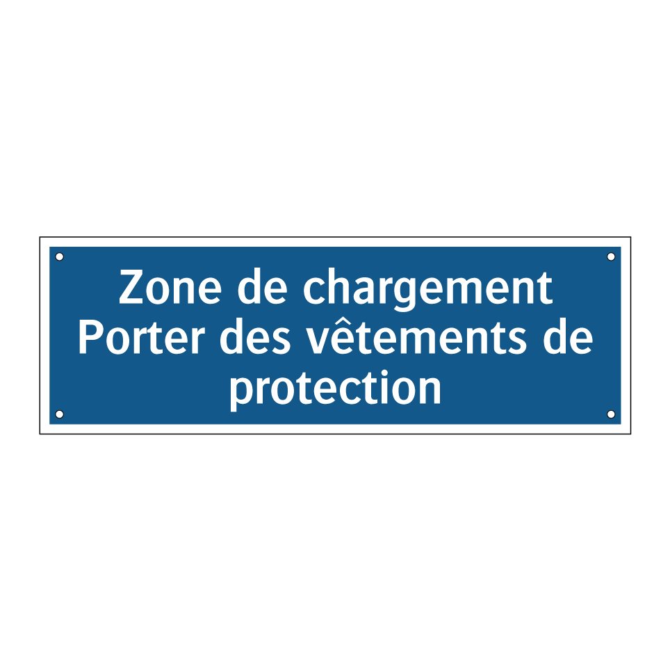 Panneau d'obligation avec le texte : "Zone de chargement Porter des vêtements de protection"