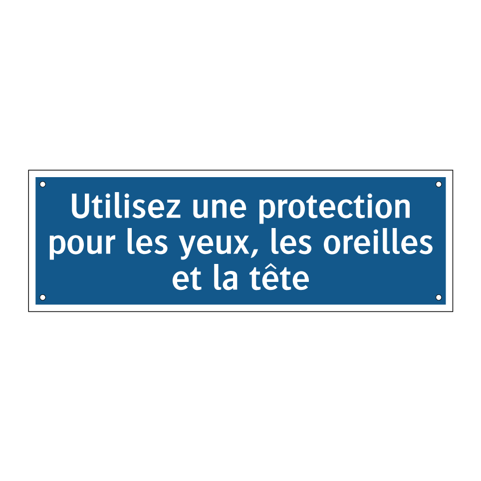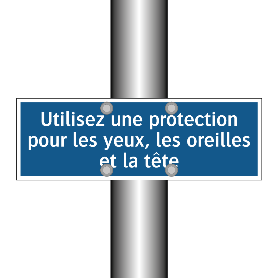 Panneau d'obligation avec le texte : "Utilisez une protection pour les yeux, les oreilles et la tête"