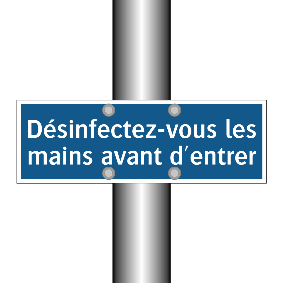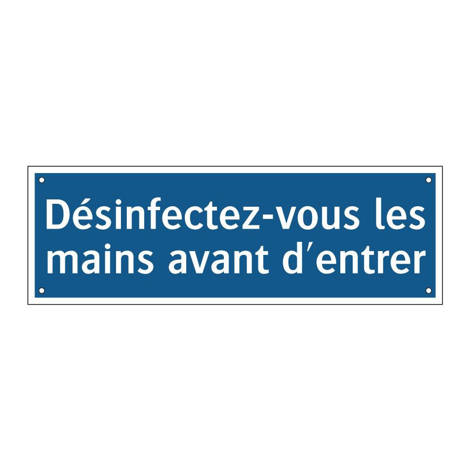 Panneau d'obligation avec le texte : "Désinfectez-vous les mains avant d'entrer"