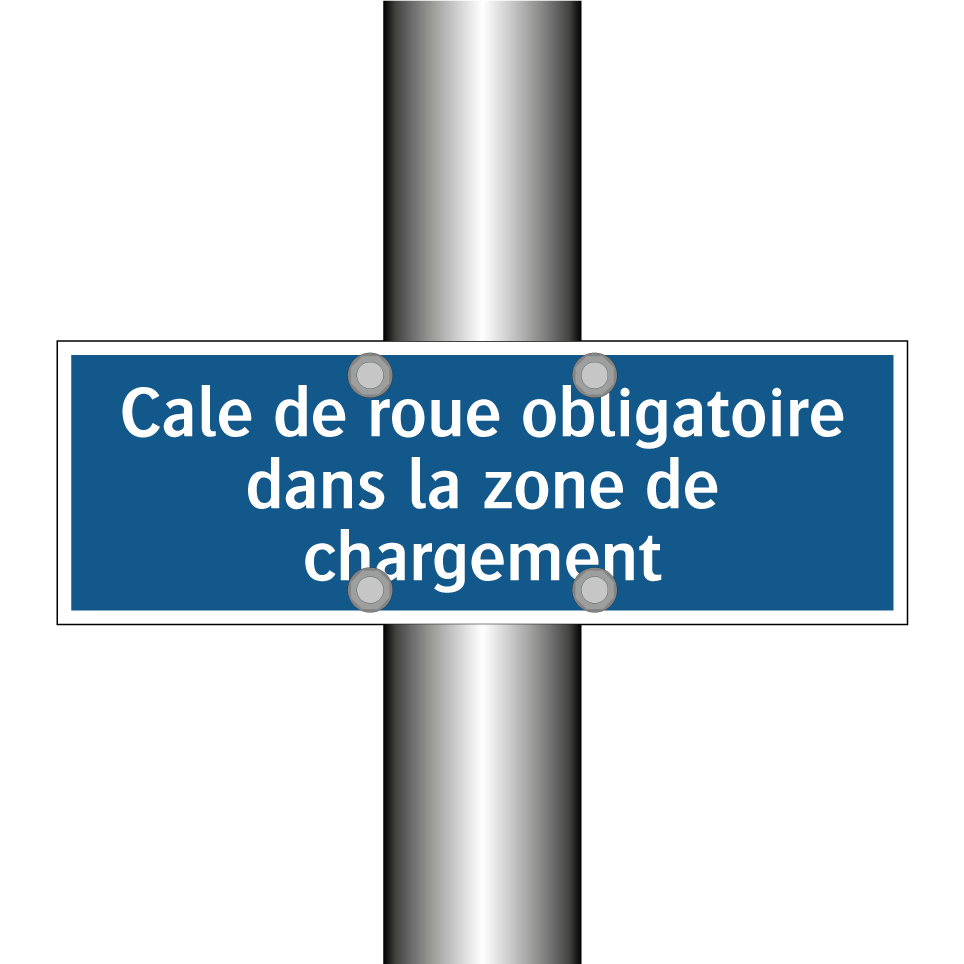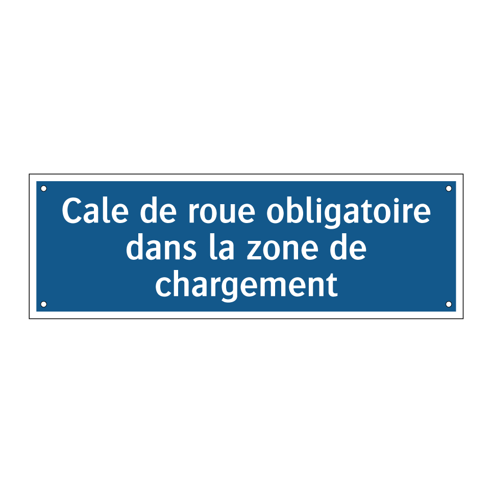Panneau d'obligation avec le texte : "Cale de roue obligatoire dans la zone de chargement"