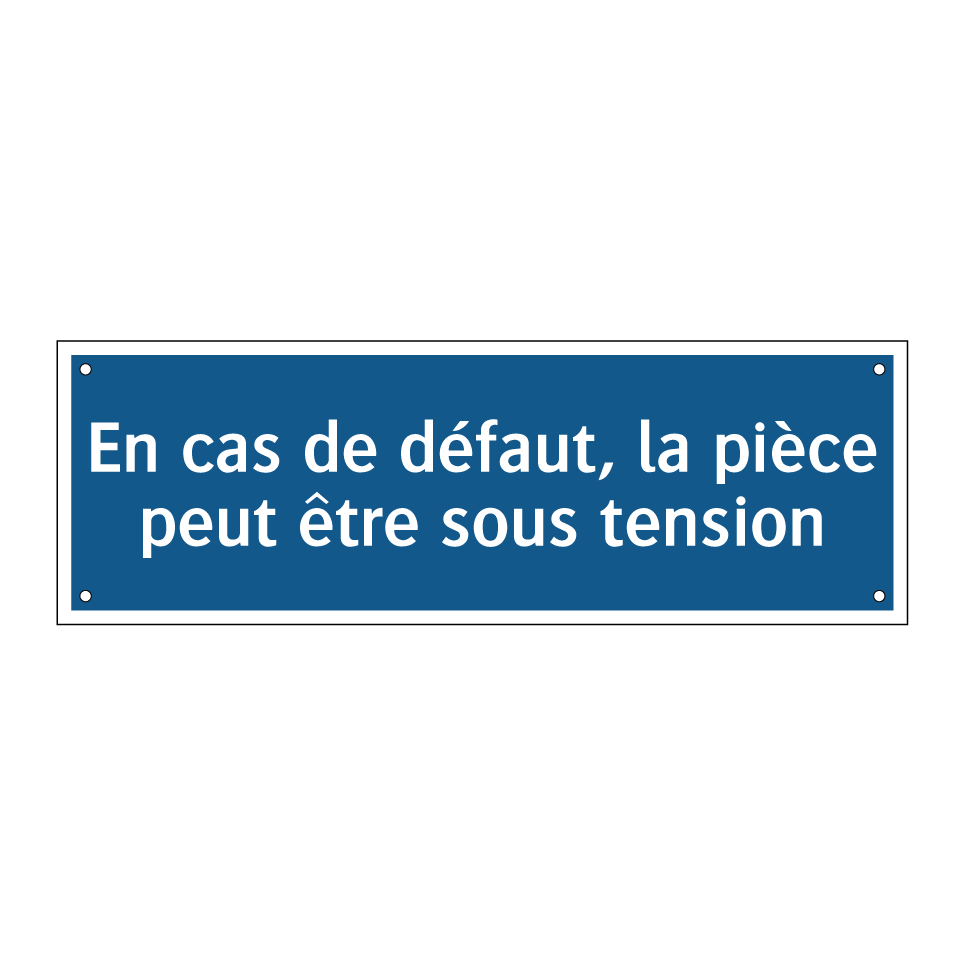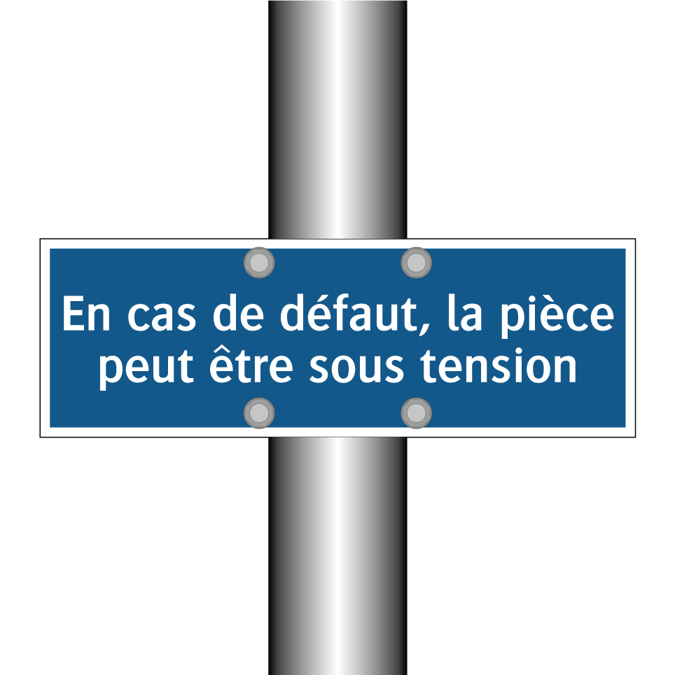 Panneau d'obligation avec le texte : "En cas de défaut, la pièce peut être sous tension"