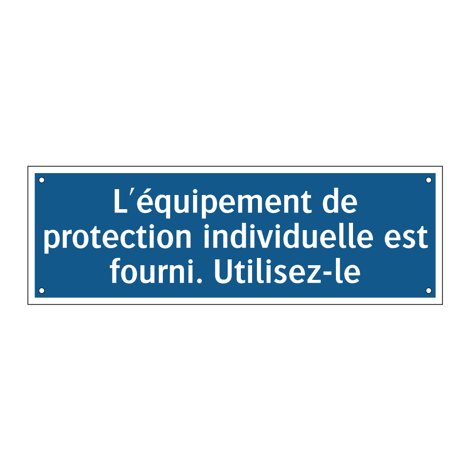 Panneau d'obligation avec le texte : "L'équipement de protection individuelle est fourni. Utilisez-le."