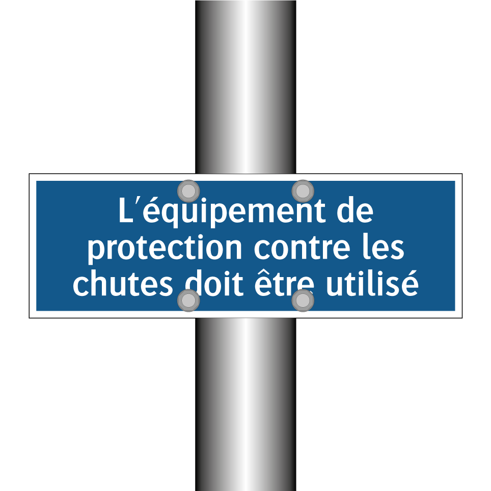 Panneau d'obligation avec le texte : "L'équipement de protection contre les chutes doit être utilisé"