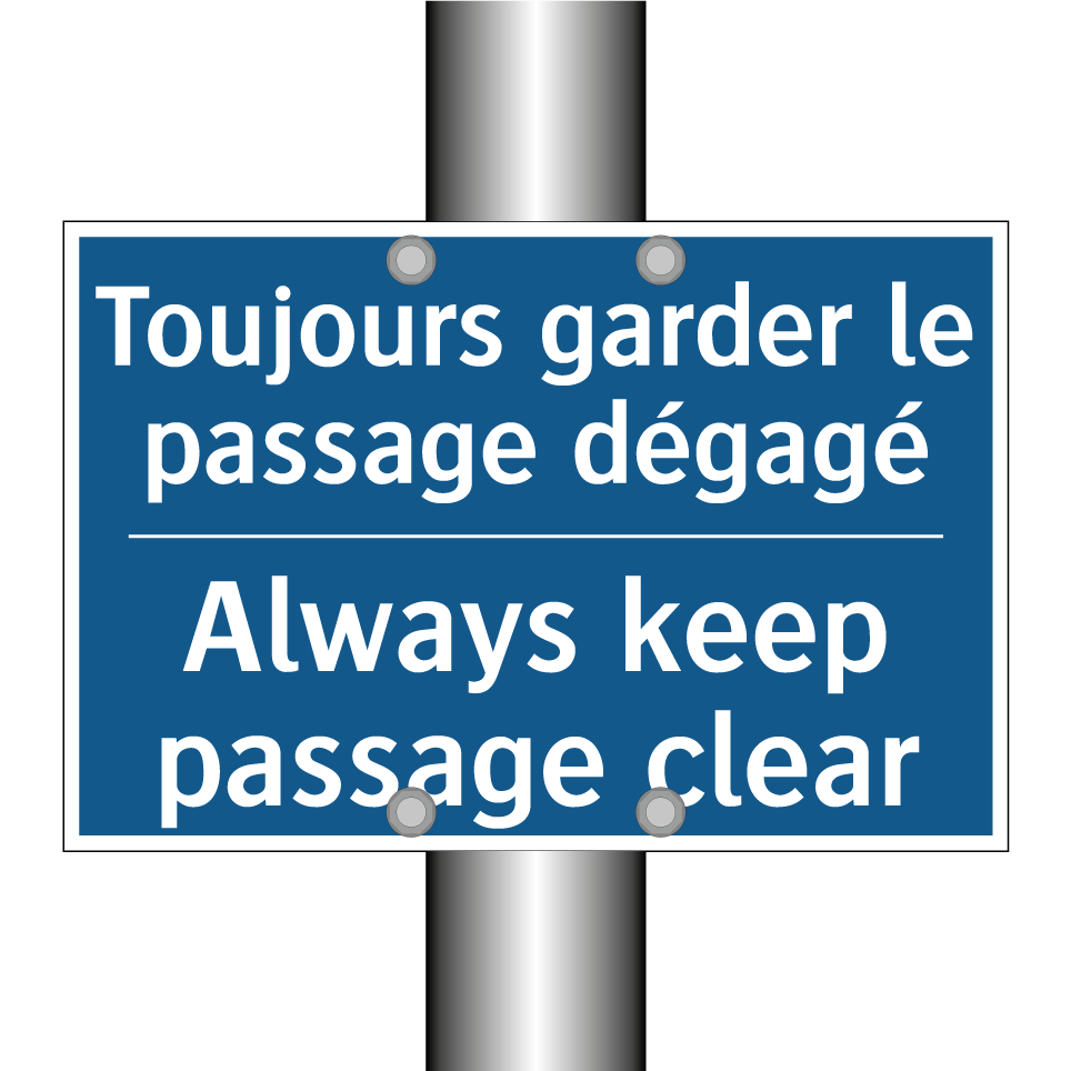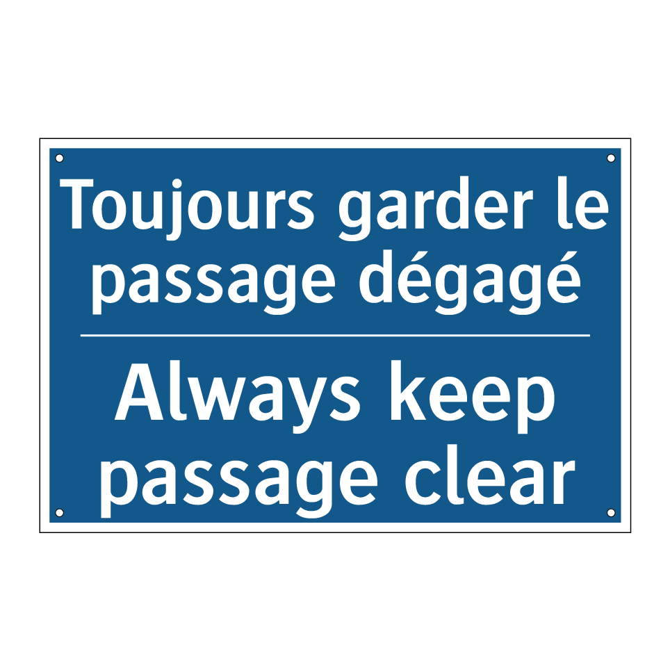 Panneau d'obligation bilingue avec texte en français : "Toujours garder le passage dégagé", et en anglais : "Always keep passage clear"