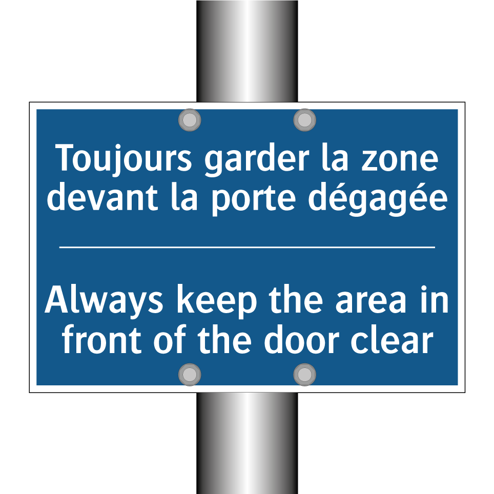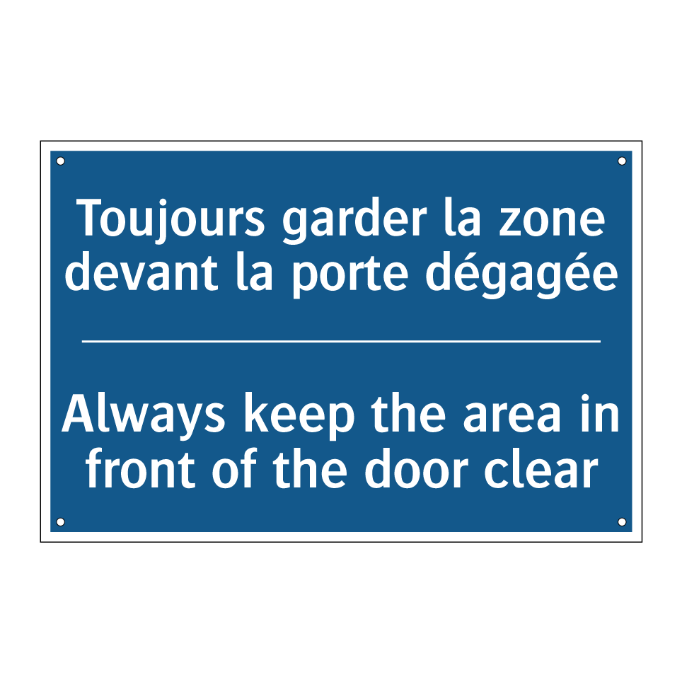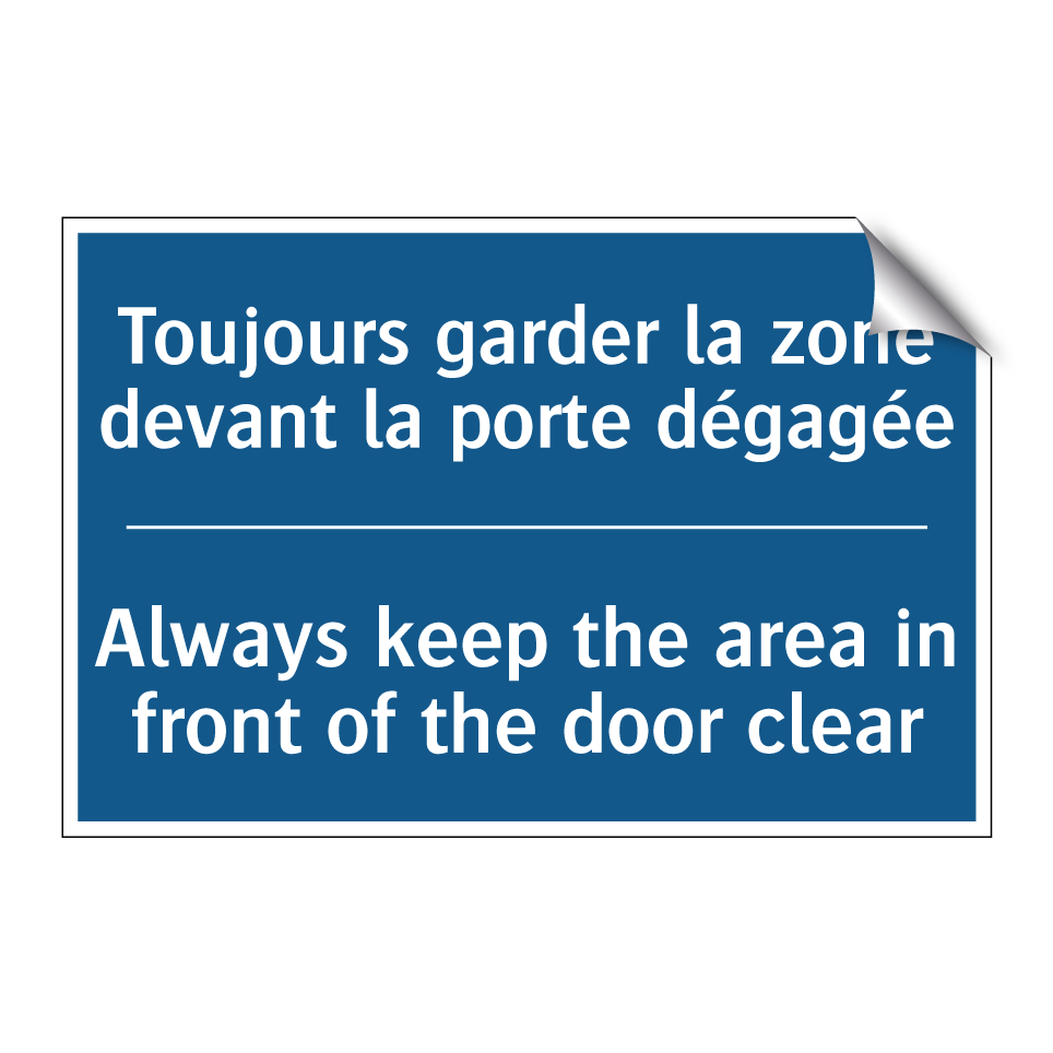Panneau d'obligation bilingue avec texte en français : "Toujours garder la zone devant la porte dégagée", et en anglais : "Always keep the area in front of the door clear"