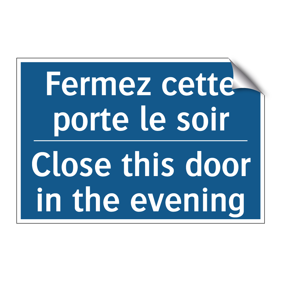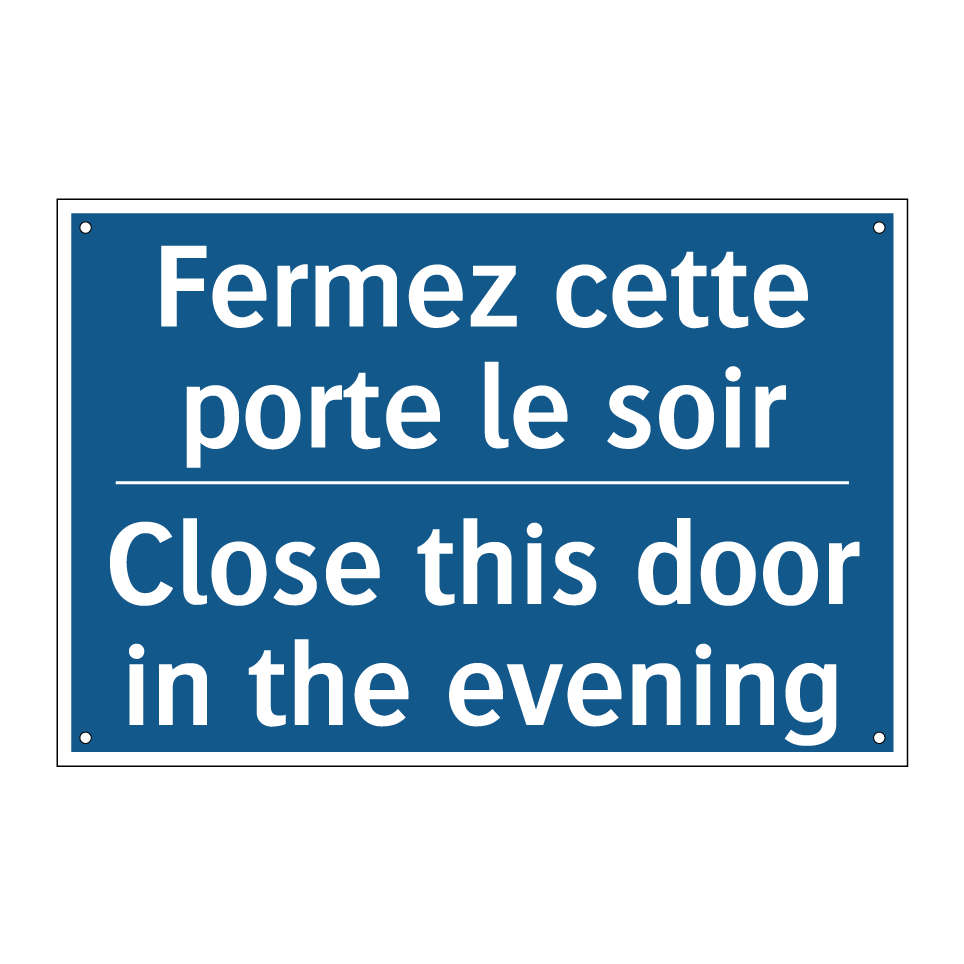 Panneau d'obligation bilingue avec texte en français : "Fermez cette porte le soir", et en anglais : "Close this door in the evening"