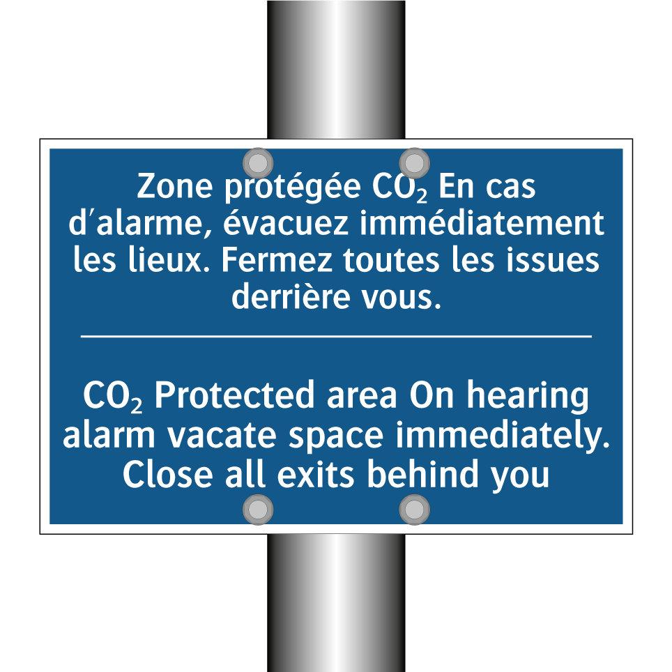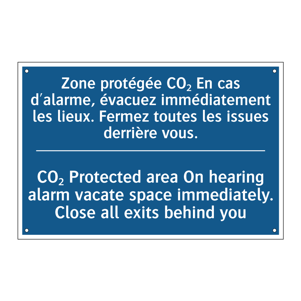 Panneau d'obligation bilingue avec texte en français : "Zone protégée CO₂ En cas d'alarme, évacuez immédiatement les lieux. Fermez toutes les issues derrière vous.", et en anglais : "CO₂ Protected area On hearing alarm vacate space immediately. Close all exits behind you"