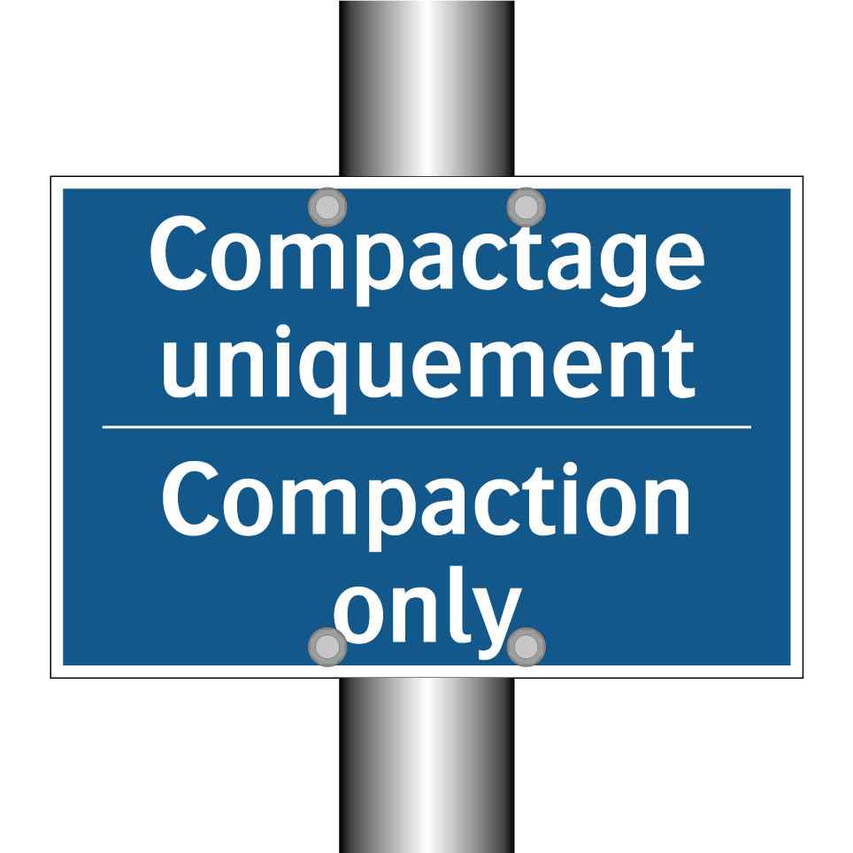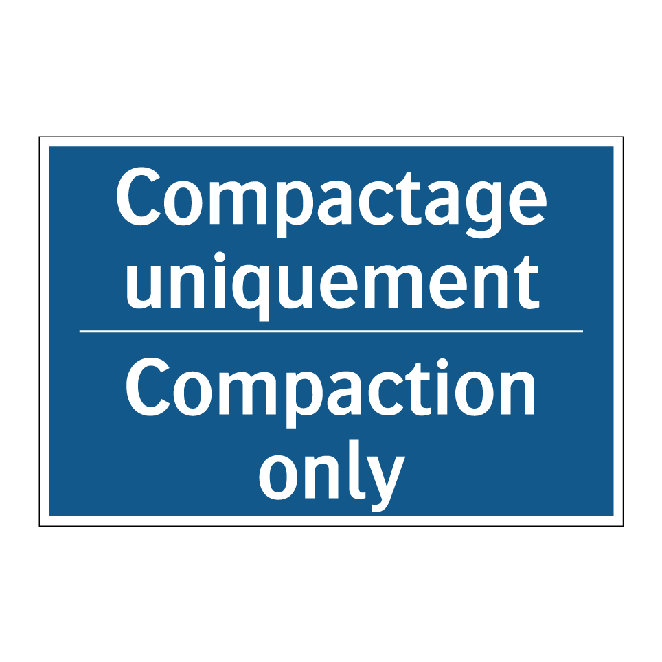 Panneau d'obligation bilingue avec texte en français : "Compactage uniquement", et en anglais : "Compaction only"