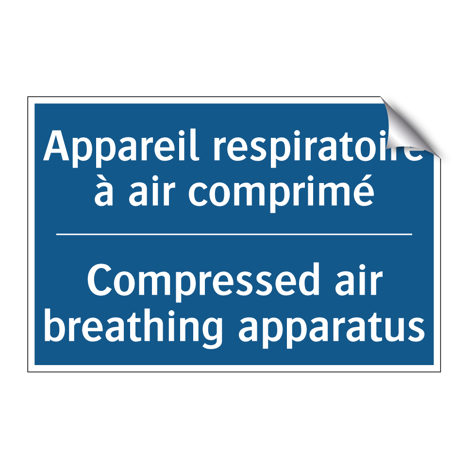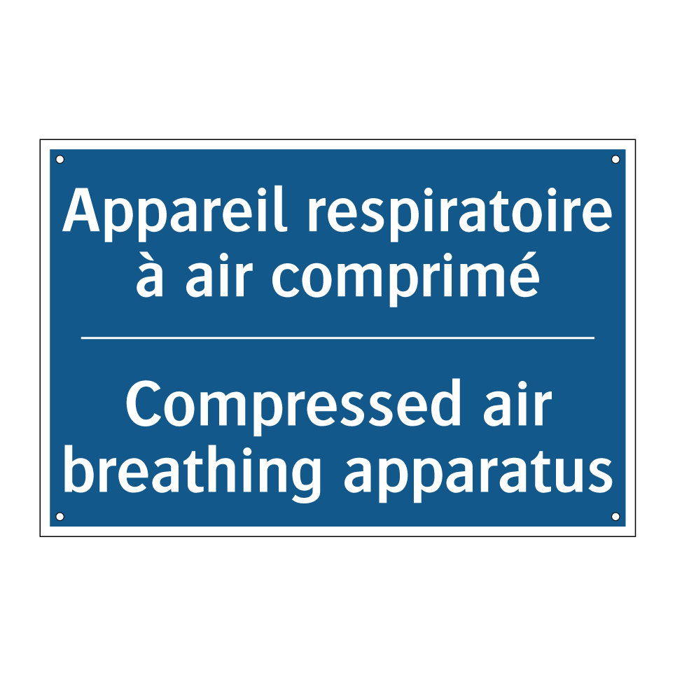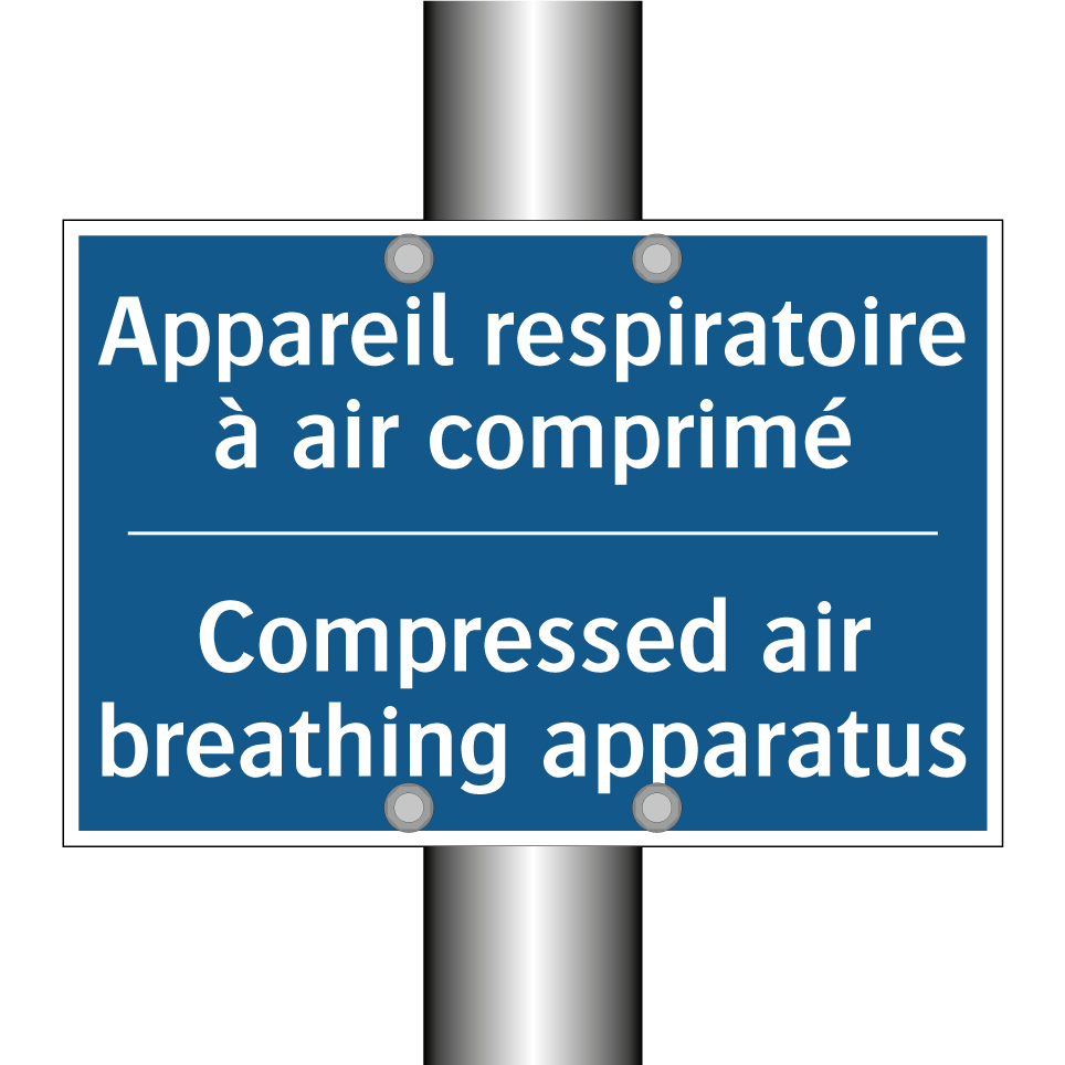 Panneau d'obligation bilingue avec texte en français : "Appareil respiratoire à air comprimé", et en anglais : "Compressed air breathing apparatus"