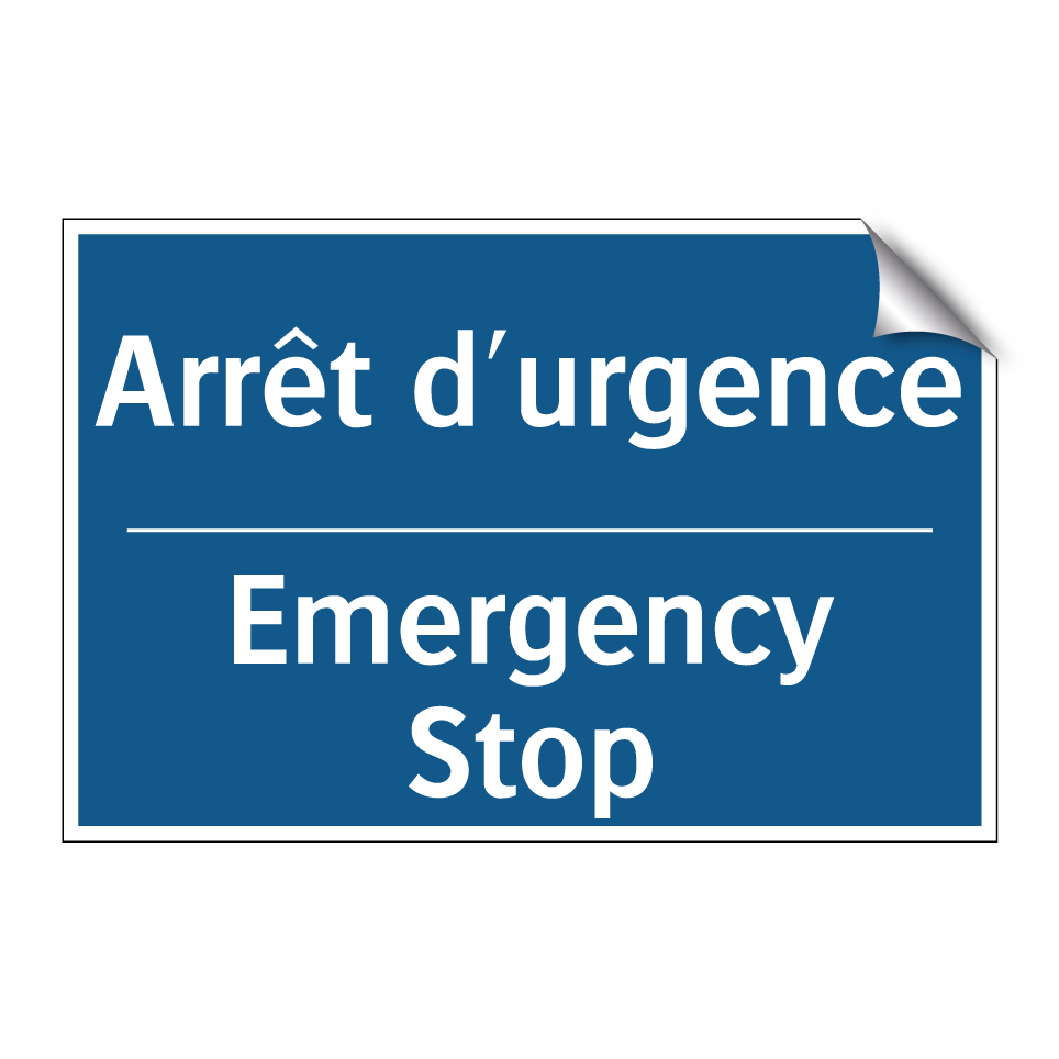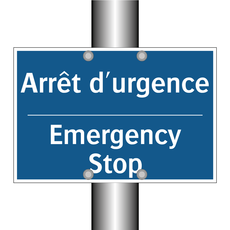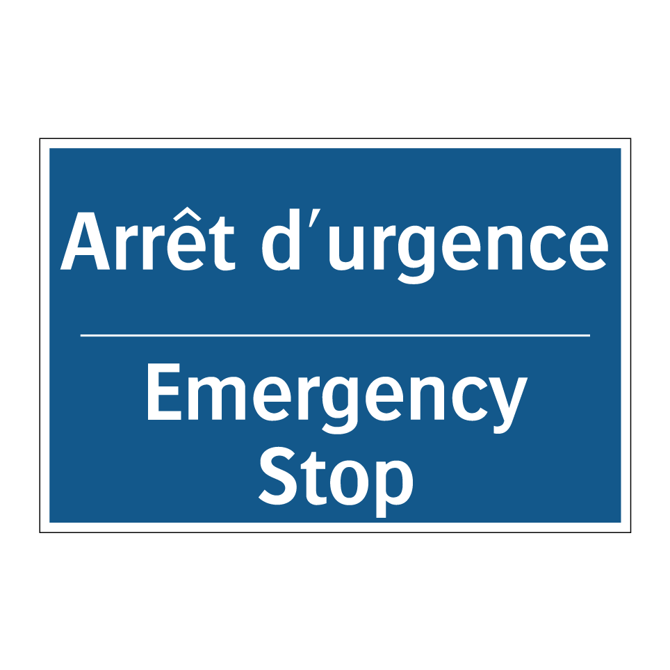 Panneau d'obligation bilingue avec texte en français : "Arrêt d'urgence", et en anglais : "Emergency Stop"