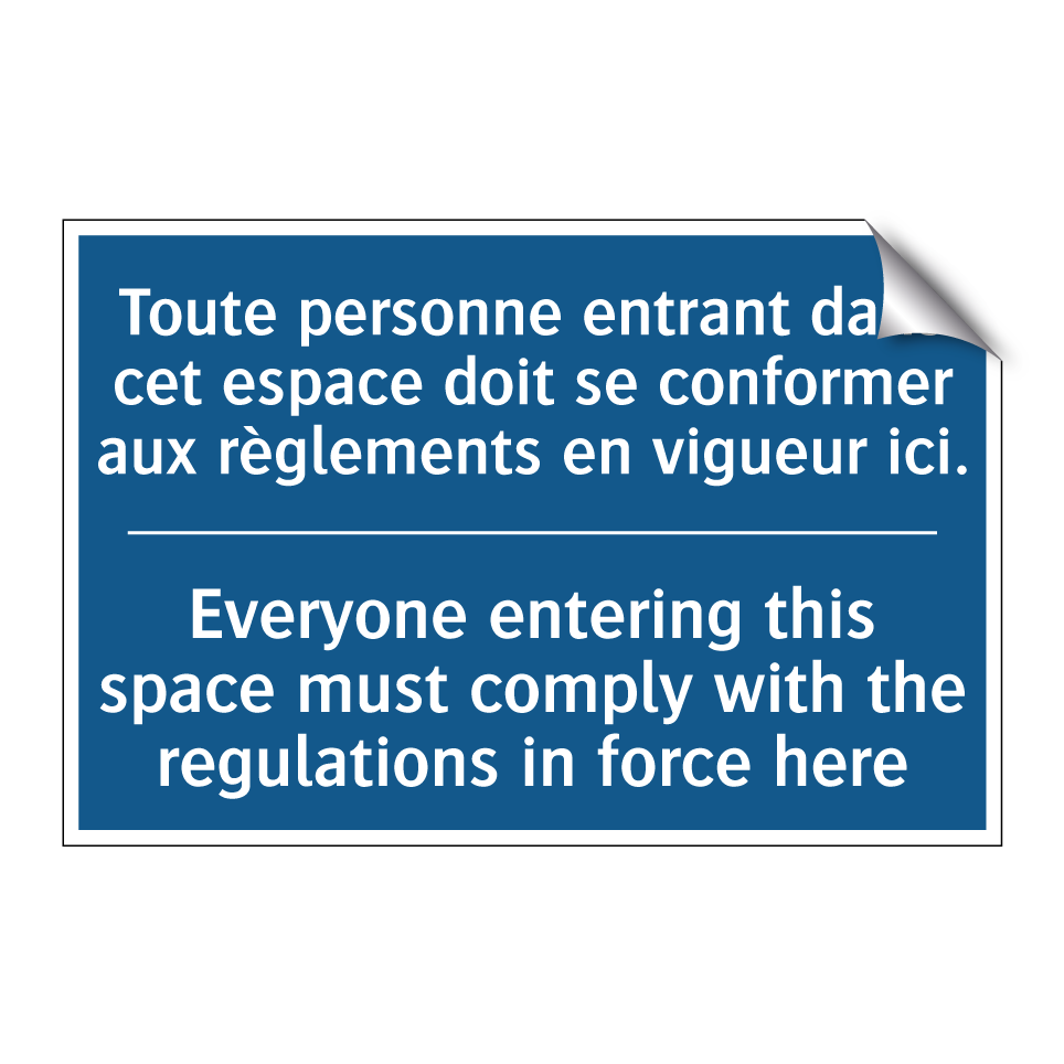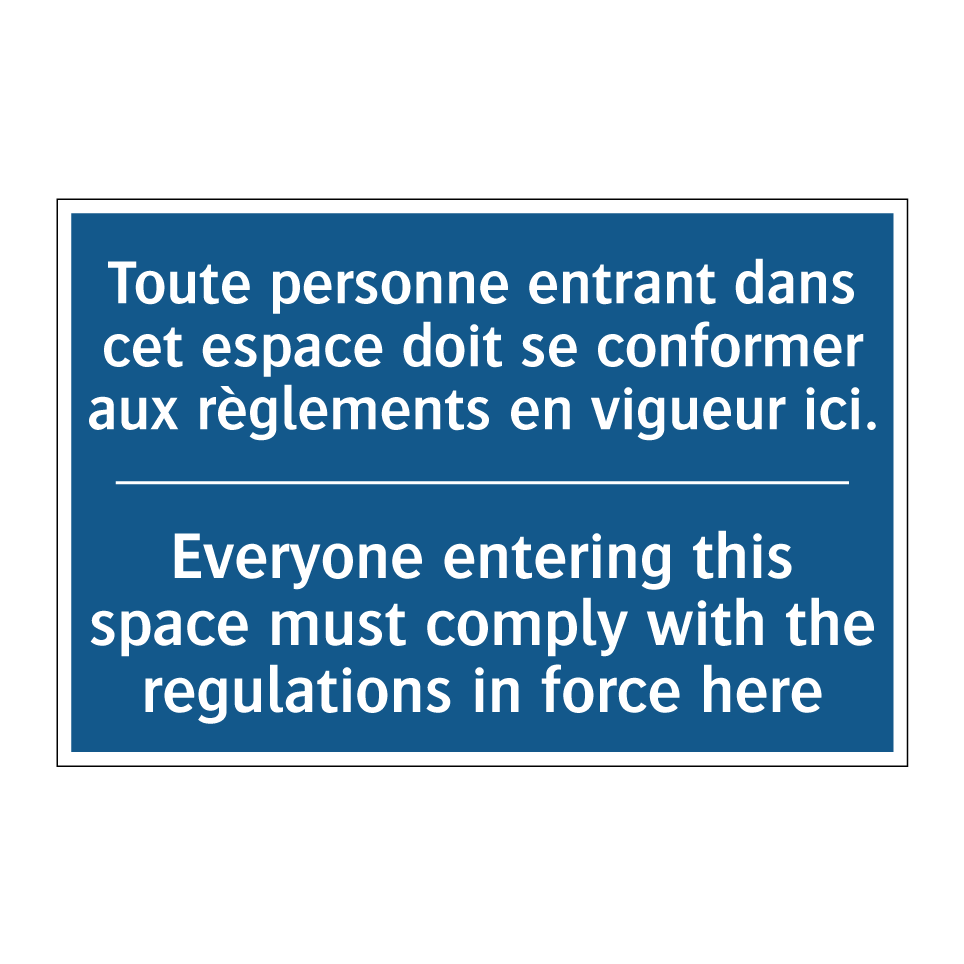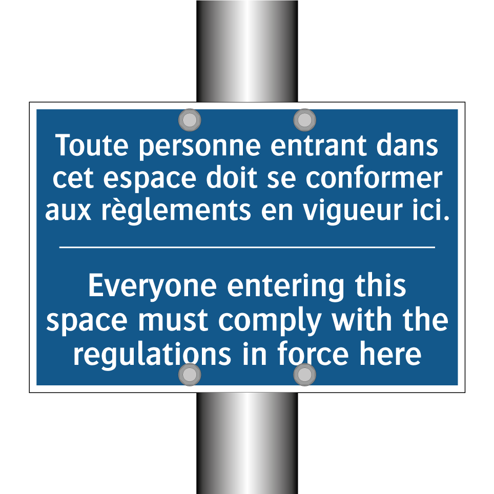 Panneau d'obligation bilingue avec texte en français : "Toute personne entrant dans cet espace doit se conformer aux règlements en vigueur ici.", et en anglais : "Everyone entering this space must comply with the regulations in force here"