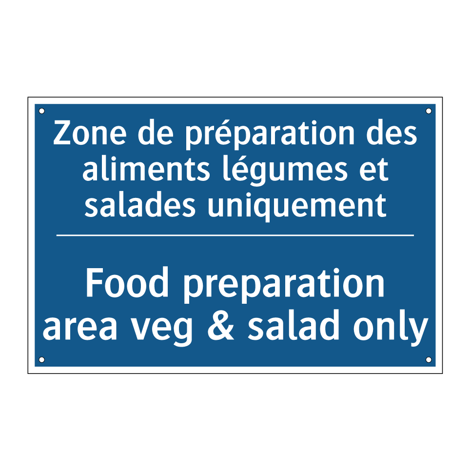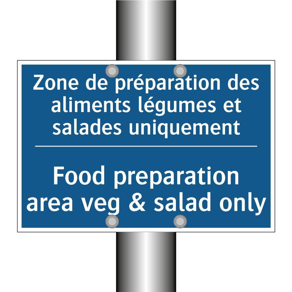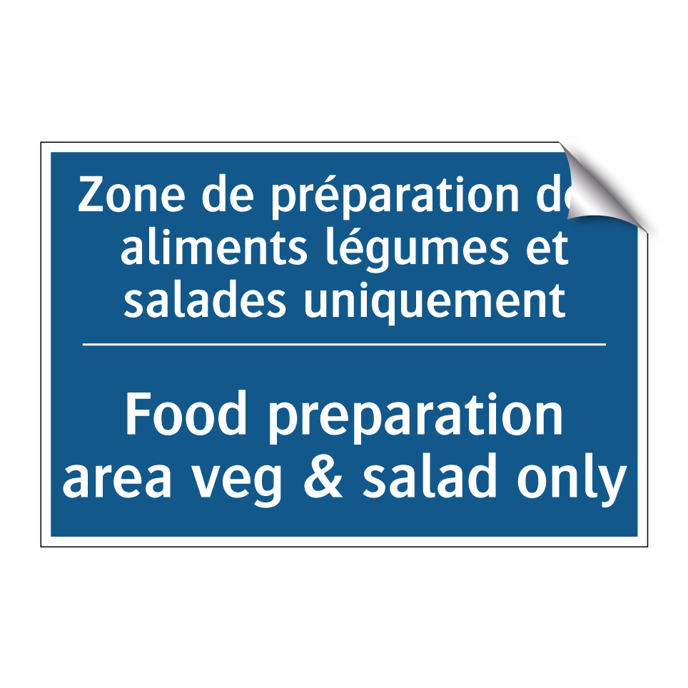 Panneau d'obligation bilingue avec texte en français : "Zone de préparation des aliments légumes et salades uniquement", et en anglais : "Food preparation area veg & salad only"
