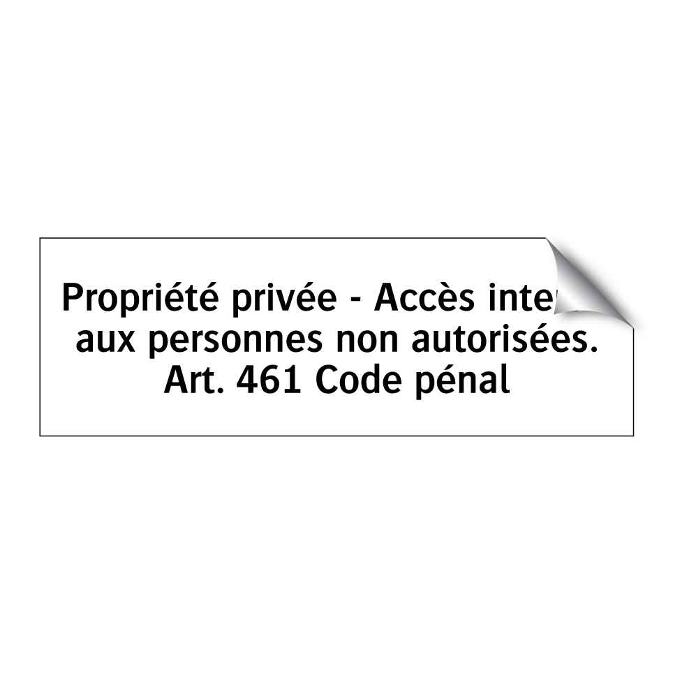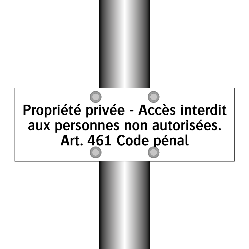 Panneau d'interdiction avec le texte : "Propriété privée - Accès interdit aux personnes non autorisées. Art. 461 Code pénal"