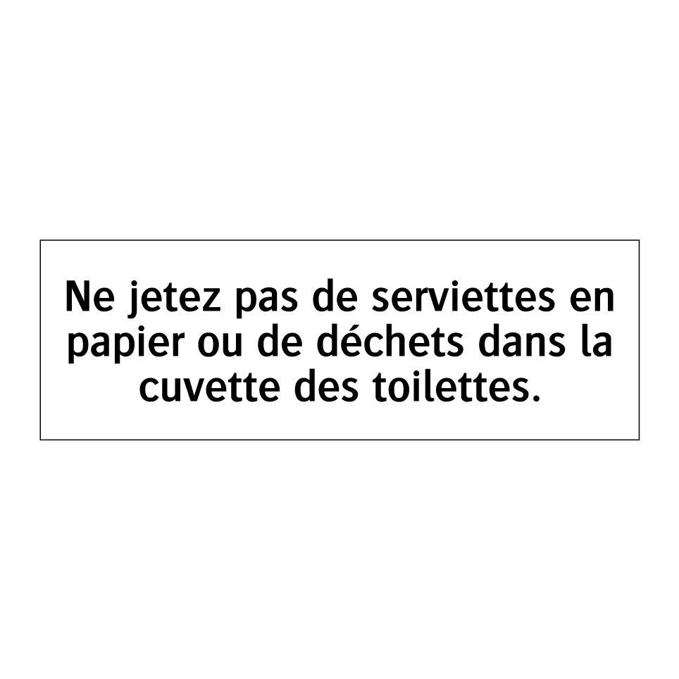 Panneau d'interdiction avec le texte : "Ne jetez pas de serviettes en papier ou de déchets dans la cuvette des toilettes."