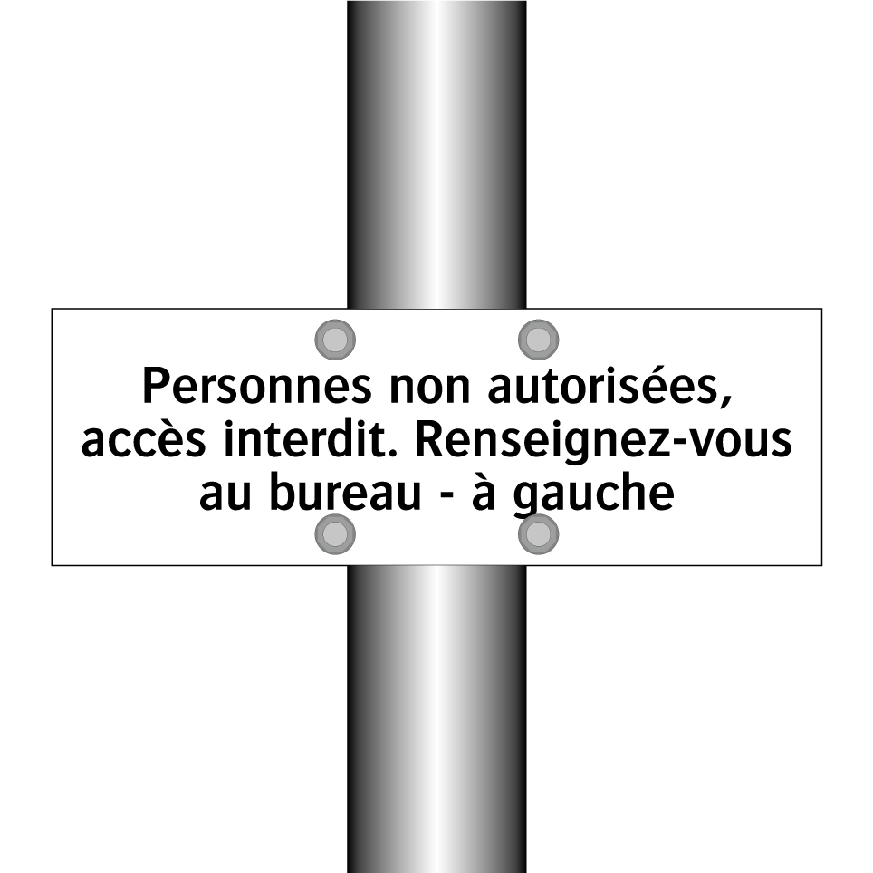 Panneau d'interdiction avec le texte : "Personnes non autorisées, accès interdit. Renseignez-vous au bureau - à gauche"