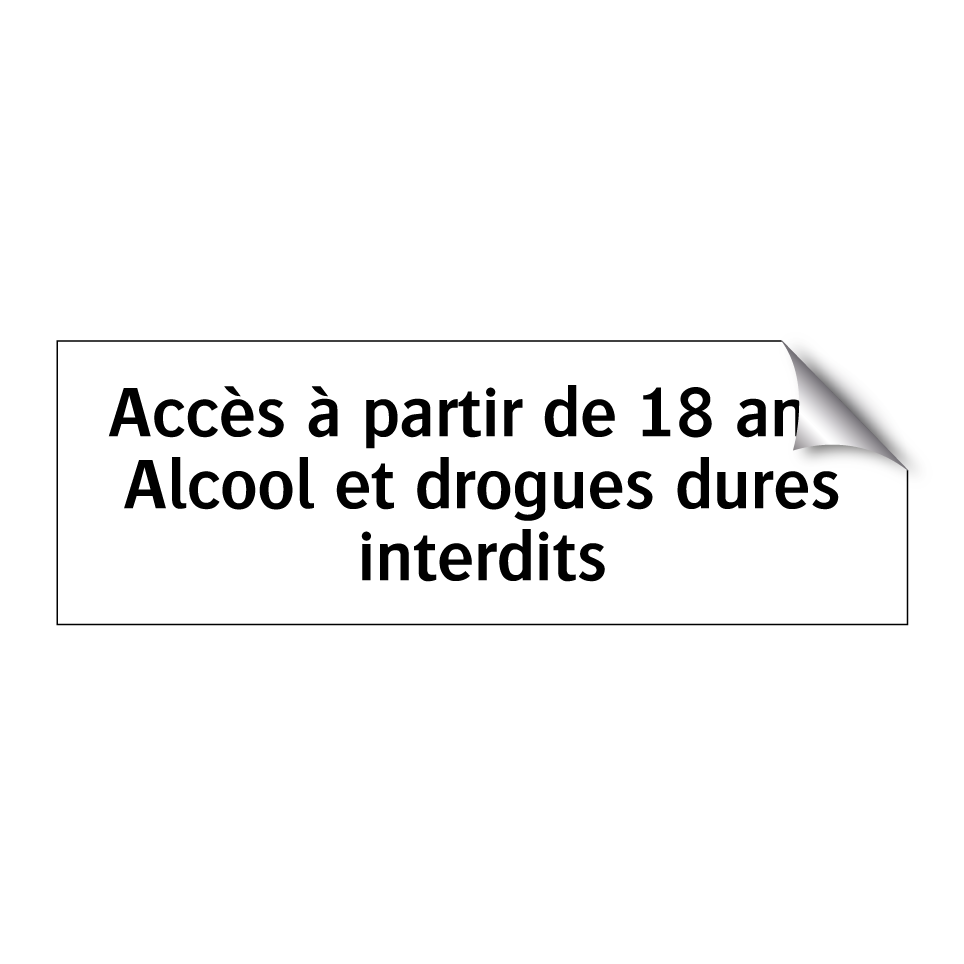Panneau d'interdiction avec le texte : "Accès à partir de 18 ans. Alcool et drogues dures interdits"