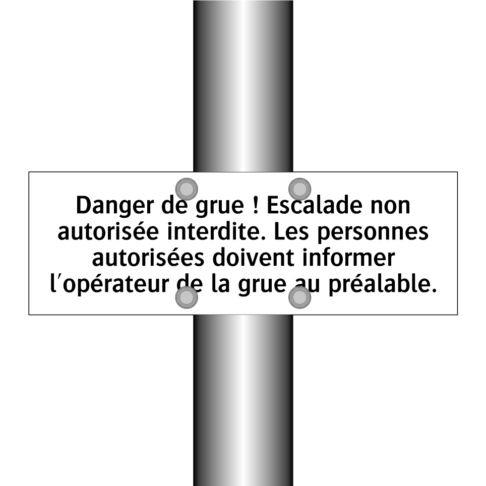 Panneau d'interdiction avec le texte : "Danger de grue ! Escalade non autorisée interdite. Les personnes autorisées doivent informer l'opérateur de la grue au préalable."