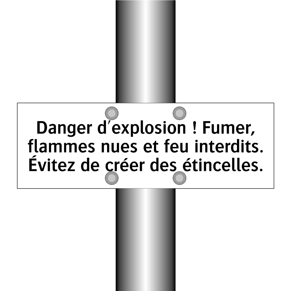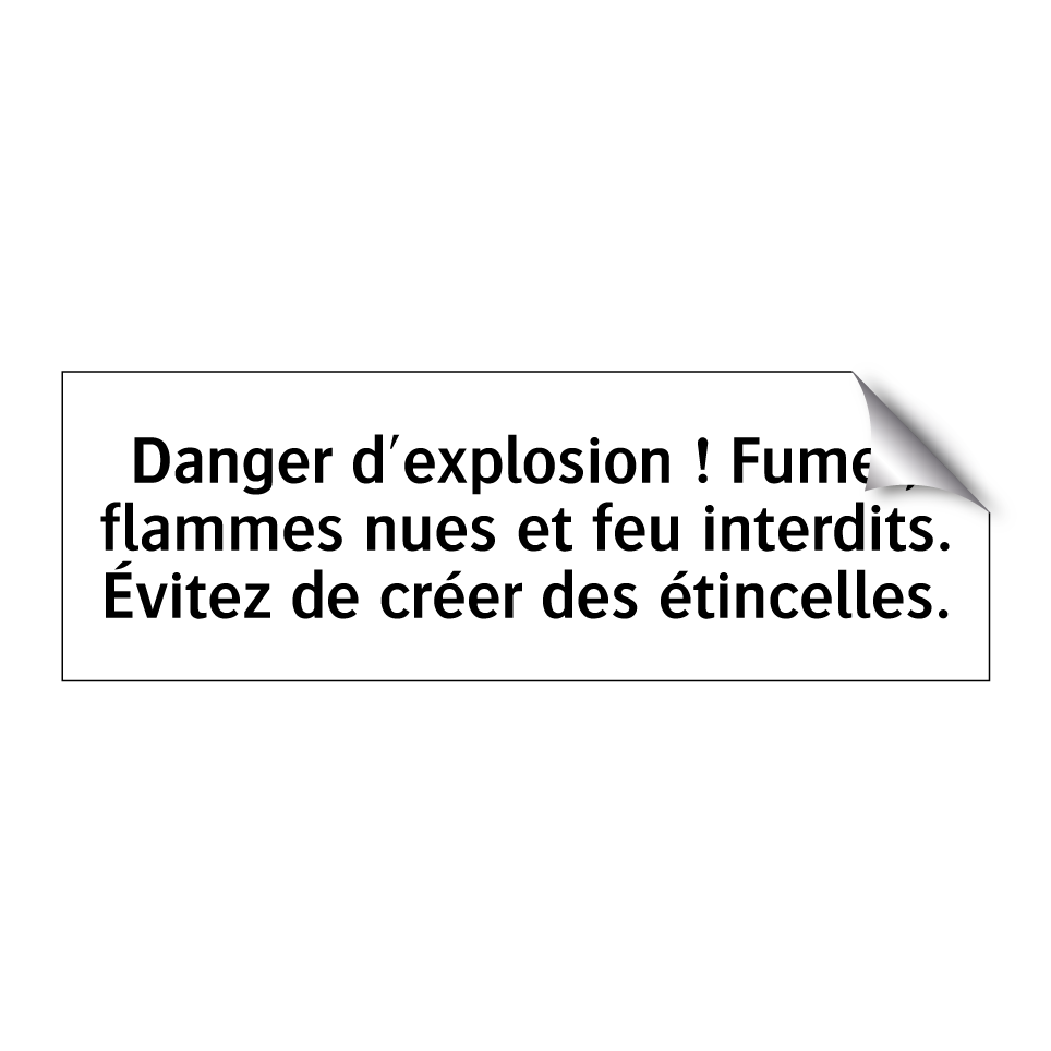 Panneau d'interdiction avec le texte : "Danger d'explosion ! Fumer, flammes nues et feu interdits. Évitez de créer des étincelles."
