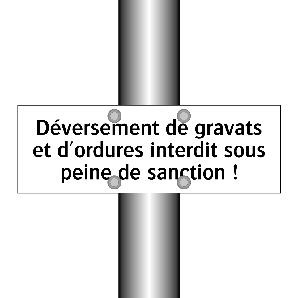 Panneau d'interdiction avec le texte : "Déversement de gravats et d'ordures interdit sous peine de sanction !"