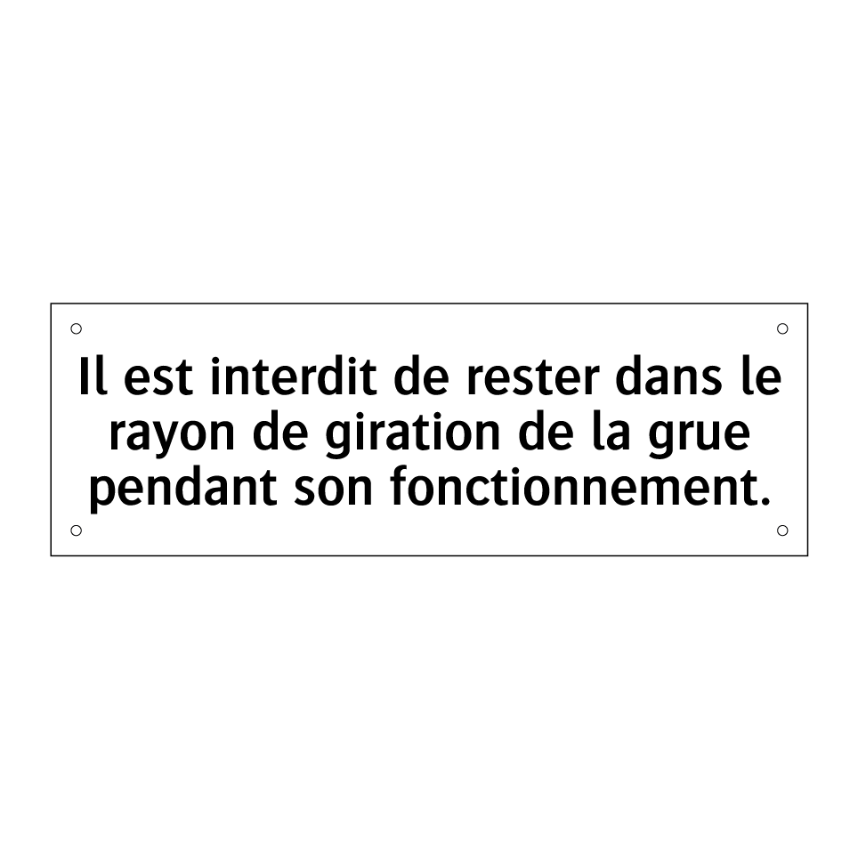 Panneau d'interdiction avec le texte : "Il est interdit de rester dans le rayon de giration de la grue pendant son fonctionnement."