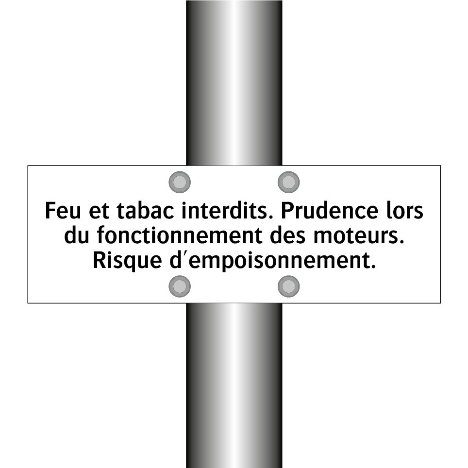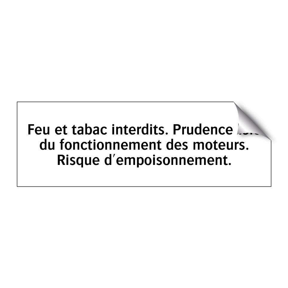 Panneau d'interdiction avec le texte : "Feu et tabac interdits. Prudence lors du fonctionnement des moteurs. Risque d'empoisonnement."