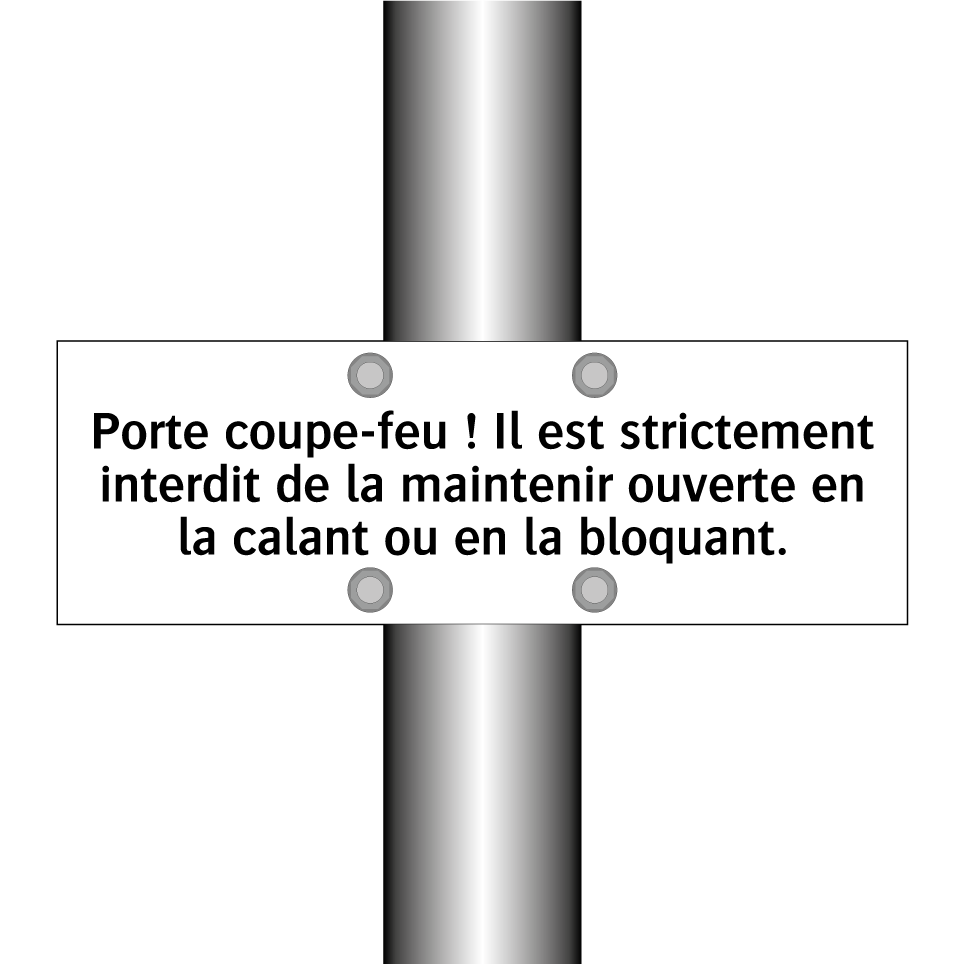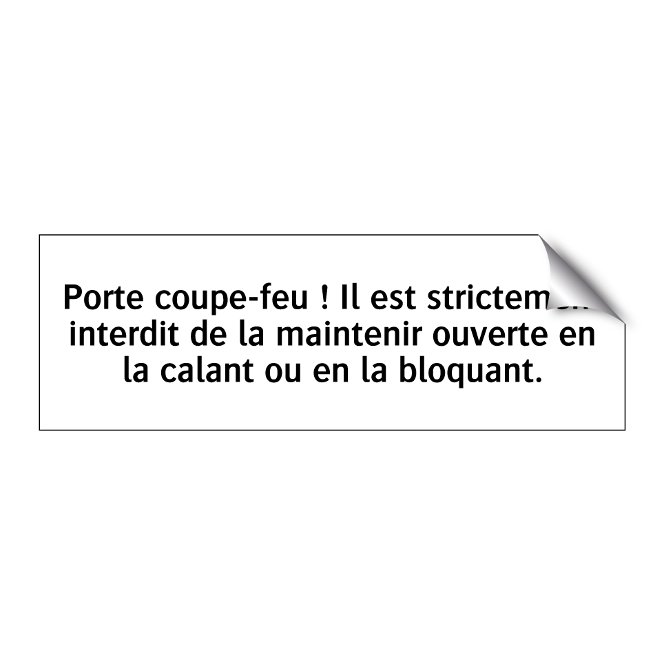 Panneau d'interdiction avec le texte : "Porte coupe-feu ! Il est strictement interdit de la maintenir ouverte en la calant ou en la bloquant."