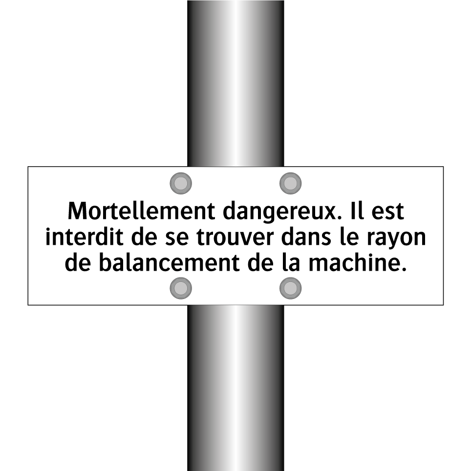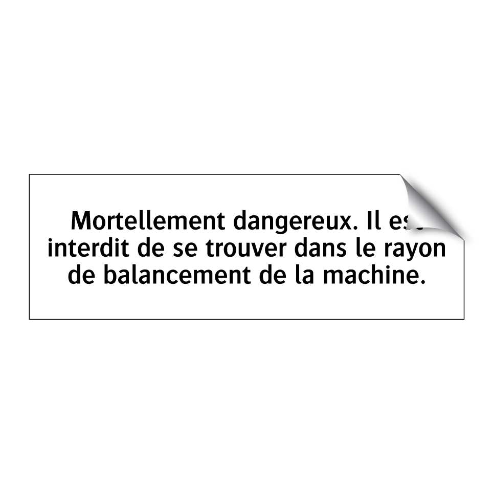 Panneau d'interdiction avec le texte : "Mortellement dangereux. Il est interdit de se trouver dans le rayon de balancement de la machine."