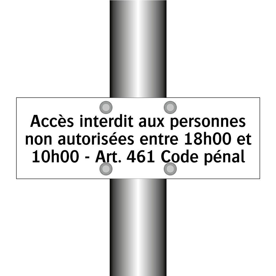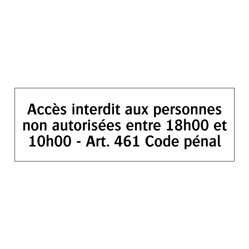 Panneau d'interdiction avec le texte : "Accès interdit aux personnes non autorisées entre 18h00 et 10h00 - Art. 461 Code pénal"