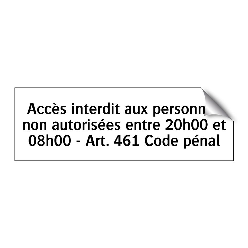 Panneau d'interdiction avec le texte : "Accès interdit aux personnes non autorisées entre 20h00 et 08h00 - Art. 461 Code pénal"