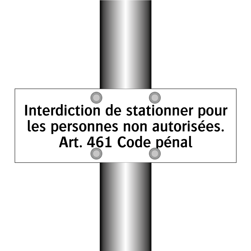 Panneau d'interdiction avec le texte : "Interdiction de stationner pour les personnes non autorisées. Art. 461 Code pénal"